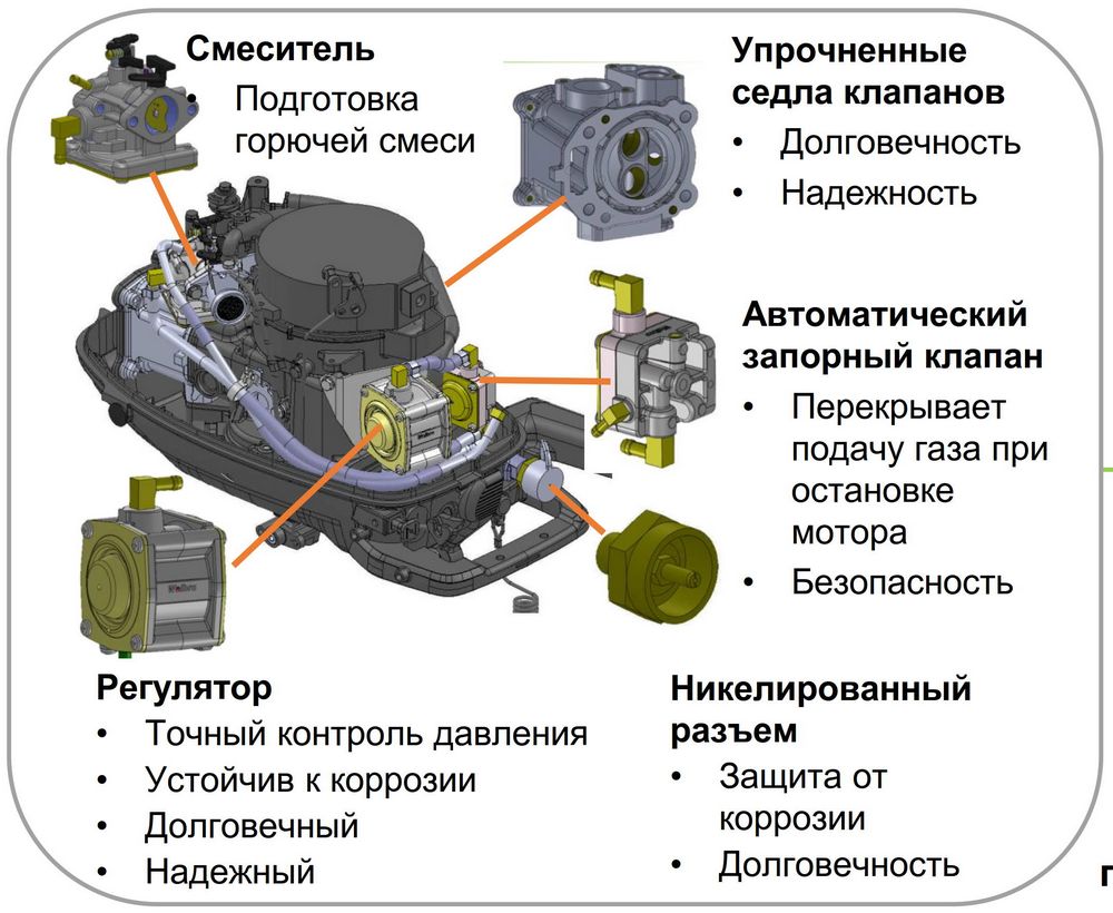 Специфіка пристрою газового двигуна Mercury F5 LPG Propane