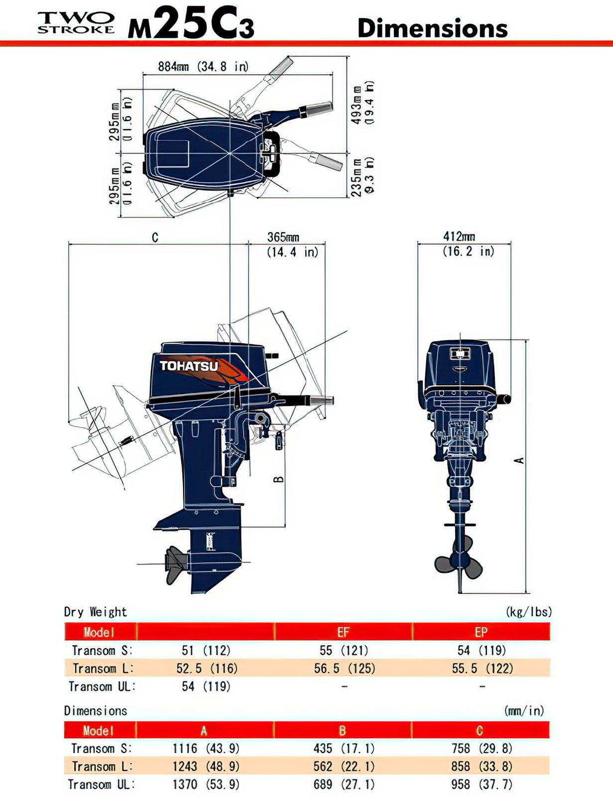 Підвісний човновий мотор Tohatsu M25HS двухткатний, двоциліндровий двигун робочим об'ємом 429 см