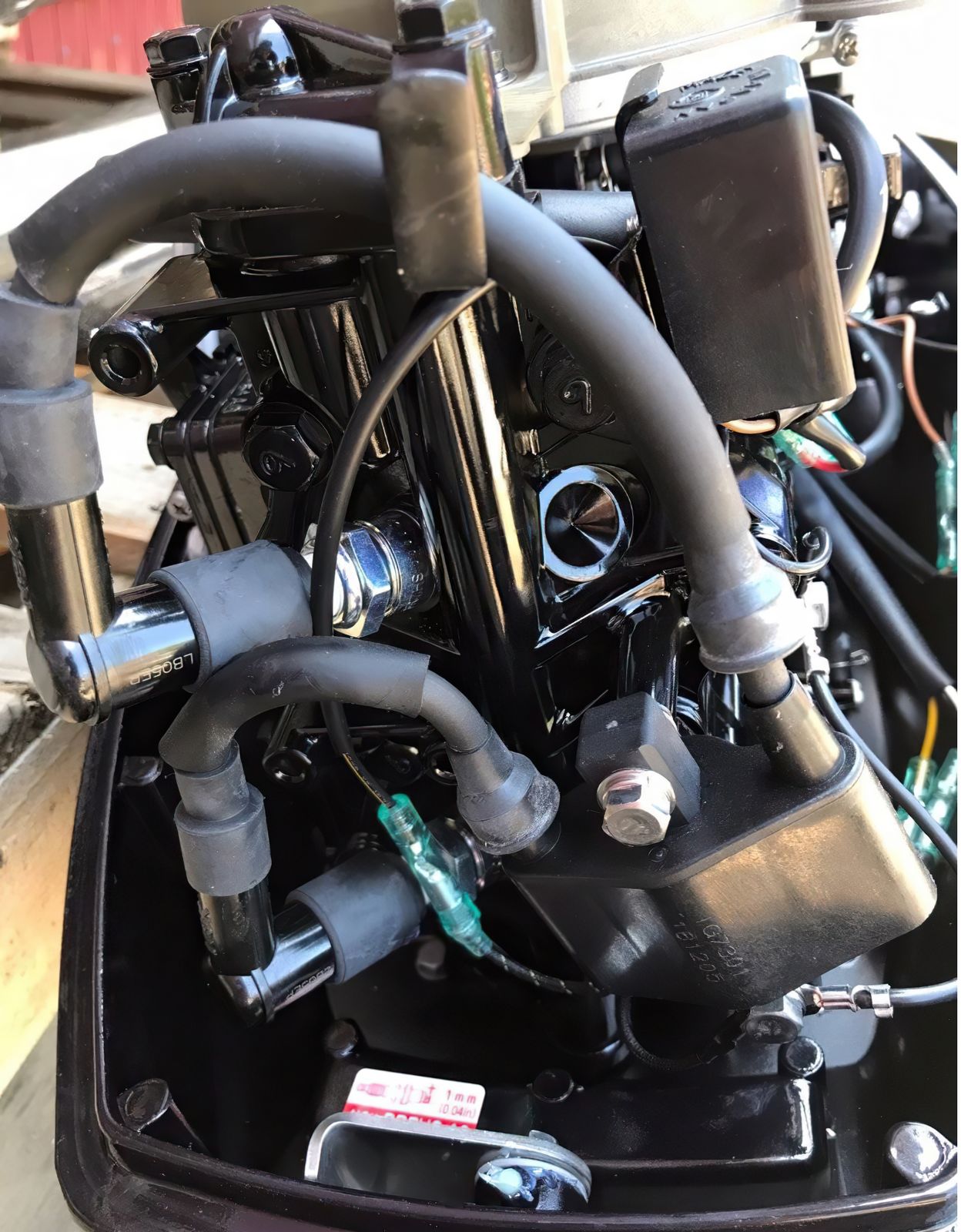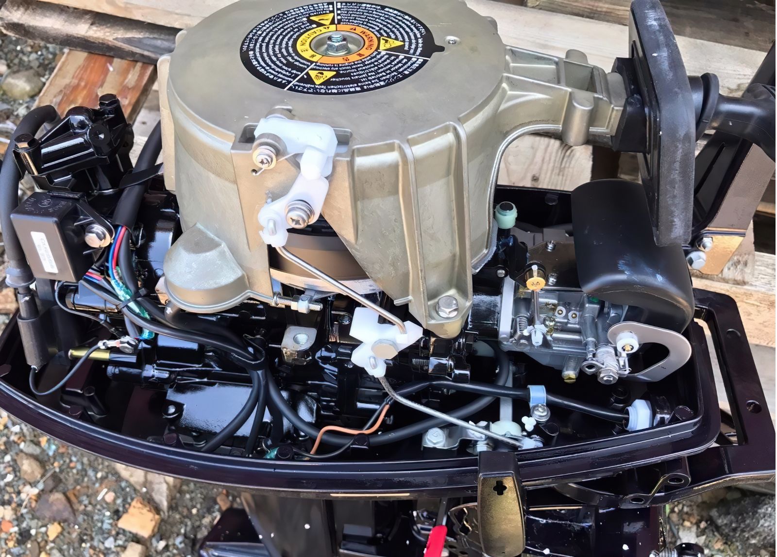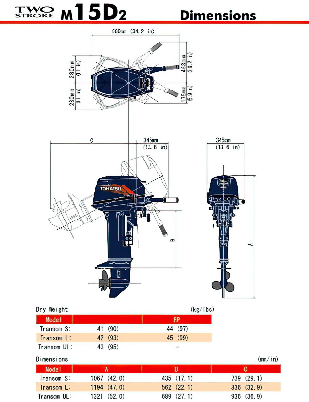 Човновий мотор Tohatsu M15D2S двотактний, двоциліндровий двигун робочим об'ємом 247 см3. Перемикання передач важелем на корпусі двигуна, модифікований карбюратор для більш плавного ходу на дуже низьких оборотах, спеціально зміцнений редуктор, посилений поворотний кронштейн станини, корпус водяної помпи з нержавіючої сталі для додаткової корозійної стійкості. Мотор вагою 41 кг і встановлюється на човни з транцевой плитою заввишки 381 мм.