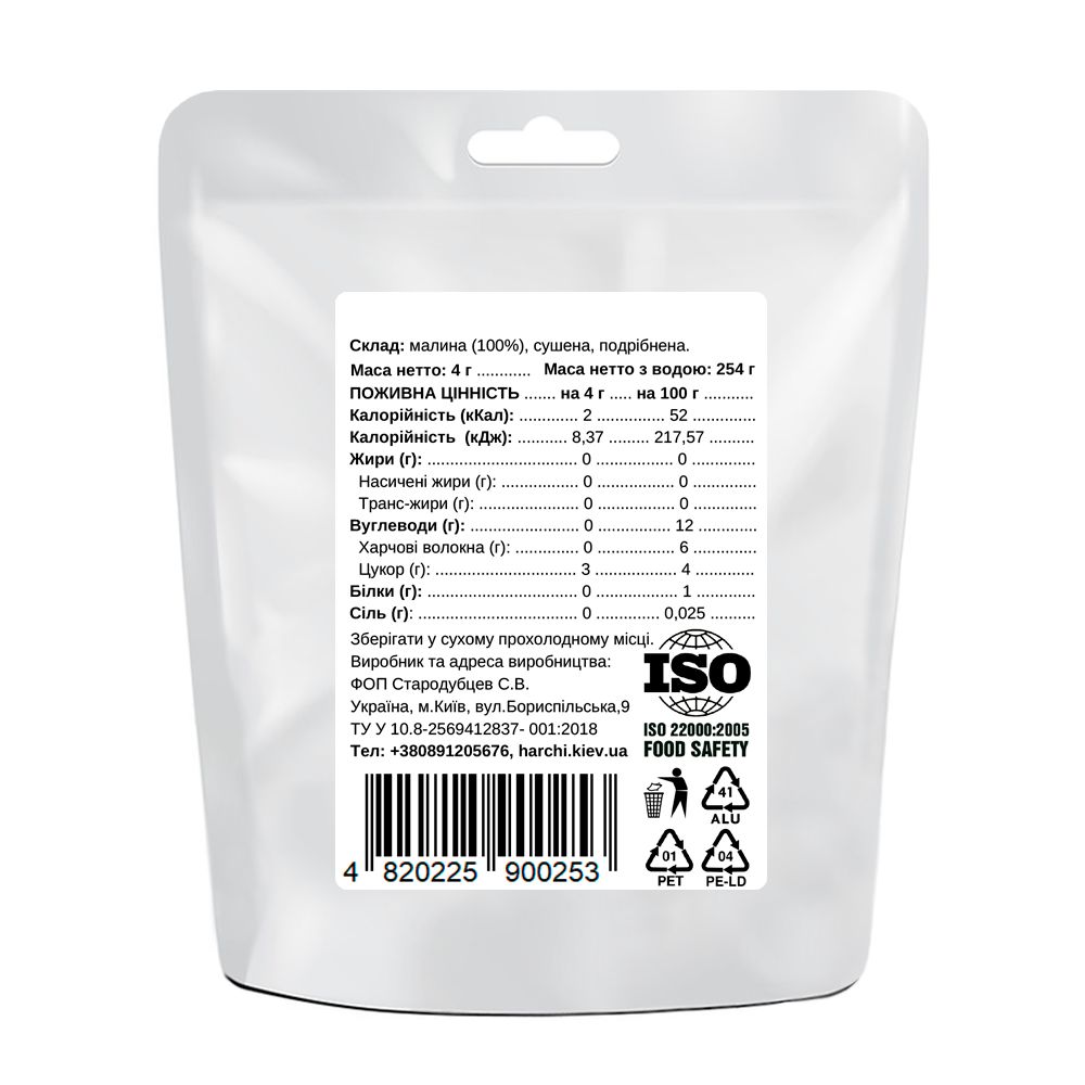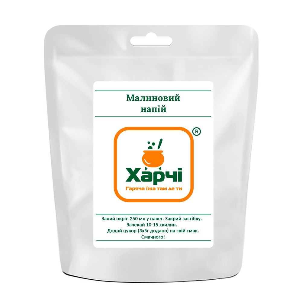 Малиновий напій чай Харчі - сублімована туристична їжа для походів. Складається з пропарених і сушених: малина (100%), висушена, подрібнена, цукор. Страву виготовлено методом сушіння натуральних продуктів без використання консервантів та ГМО.