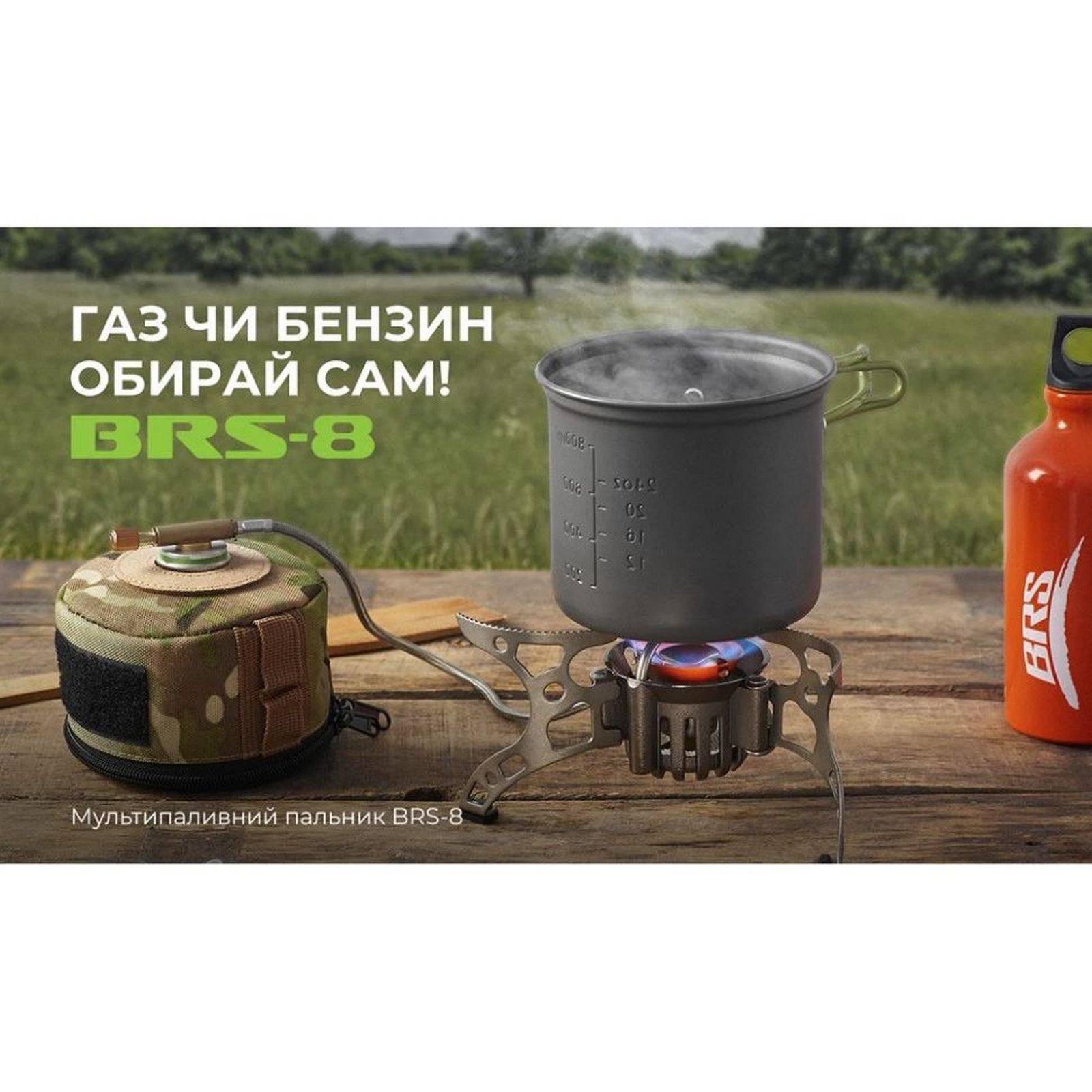 Мультитопливная горелка BRS-8 является портативным приспособлением для пикников, туристической деятельности, разных видов активного отдыха. Нефтегазовое двойное назначение. Мощность горелки достигает 4500 ватт. Материалы в составе изделия: сплавы алюминия и меди. Выдерживает нагрузку в 80 килограмм. Само приспособление весит 501 грамм. Размеры составляют 18*14*9 сантиметров.