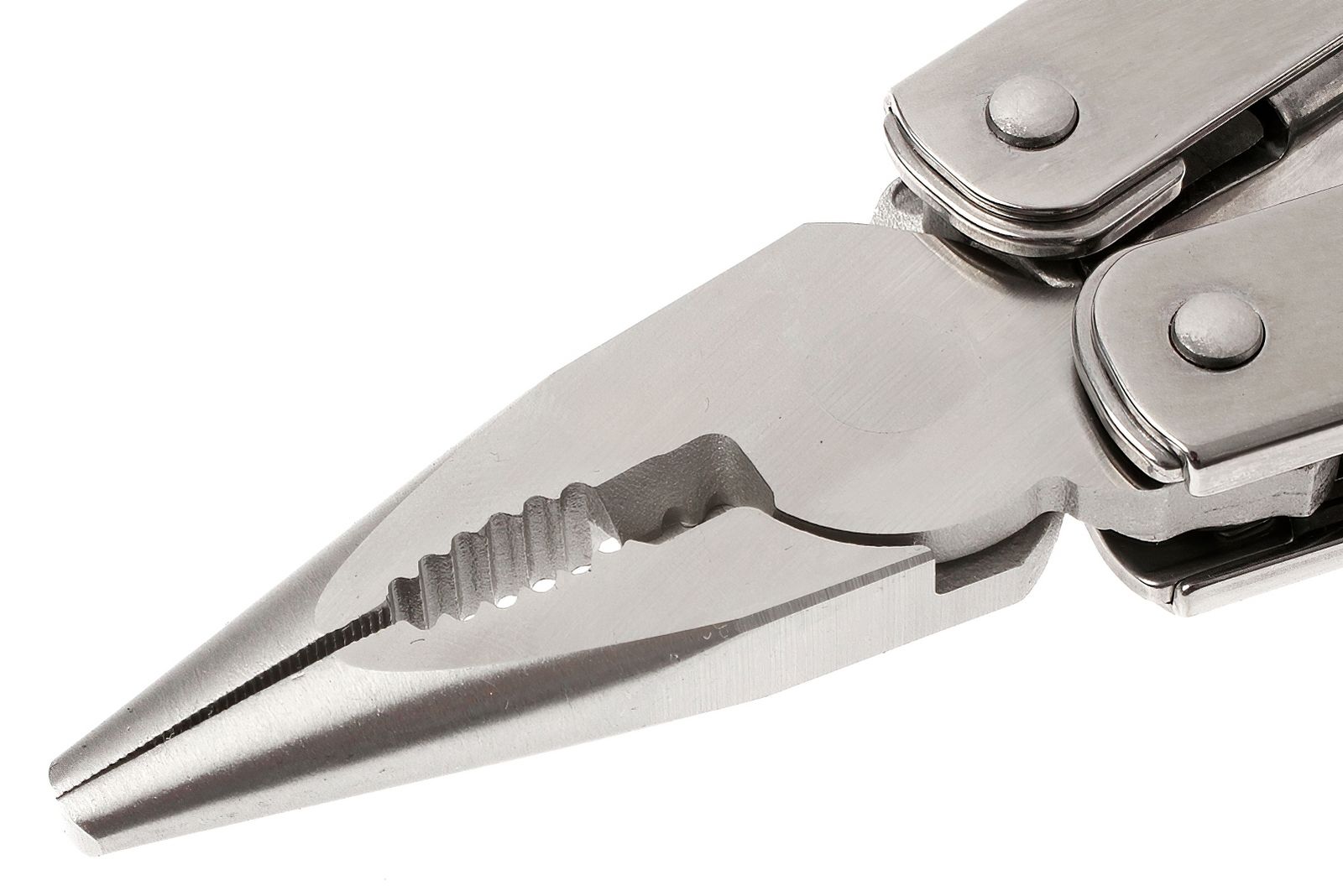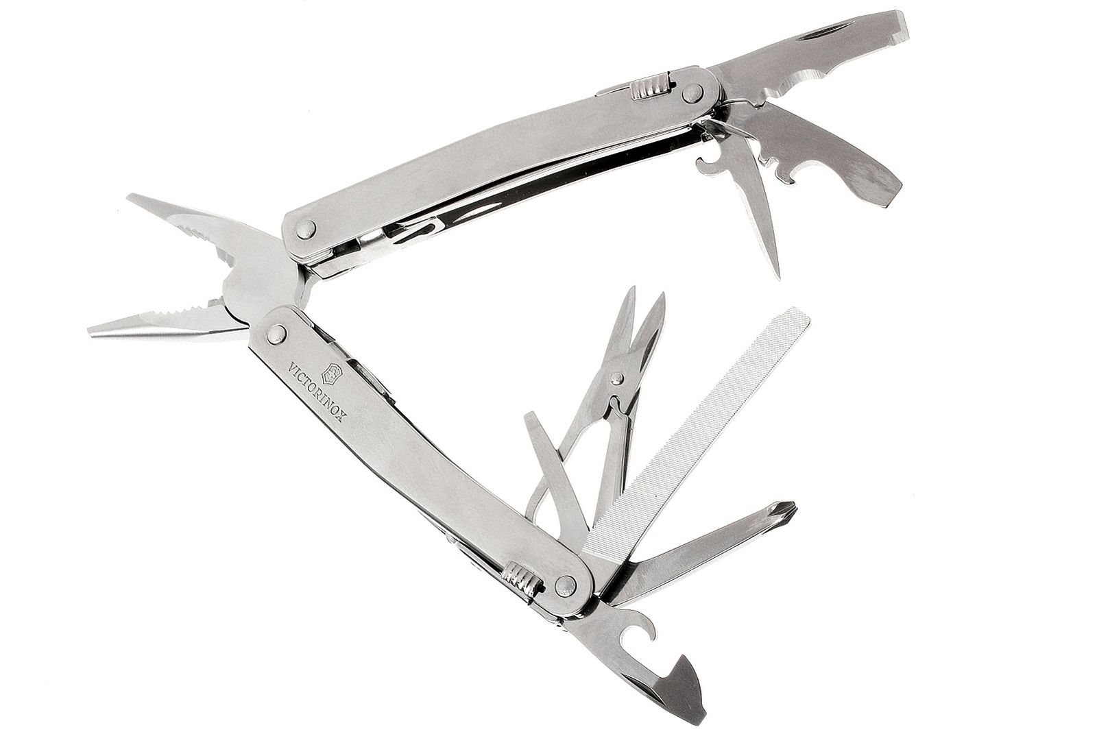Дана модель впорається з багатьма роботами. Містить чудово ріжучу пилу. Інструмент зріже гілки і розпиляти дерево. Стамеска виручить в токарній обробці дерева. А в роботі з металом, спеціальна пила з напилком. Безумовно, що в ремонтах знадобляться пристосування для зняття ізоляції, хрестова і плоскі викрутки. А так само, пасатижі, які приміром, зроблять згинання або ж опресування проводів. Під час кожного застілля будете раді мати при собі консервний ніж і відкривачку для пляшок. І звичайно, що в повсякденних цілях знадобляться ножиці.