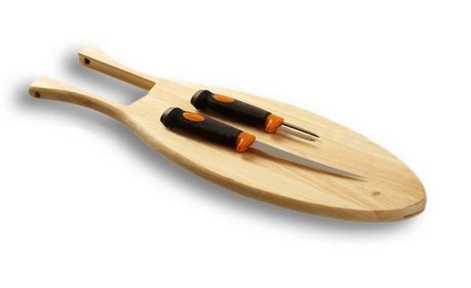Філейний ніж і вилка-тримач вкладаються в обробну дошку, як в піхви. Так зручніше зберігати прилади в одному місці. По краях дошки зроблені отвори для кріплення її до стіни.