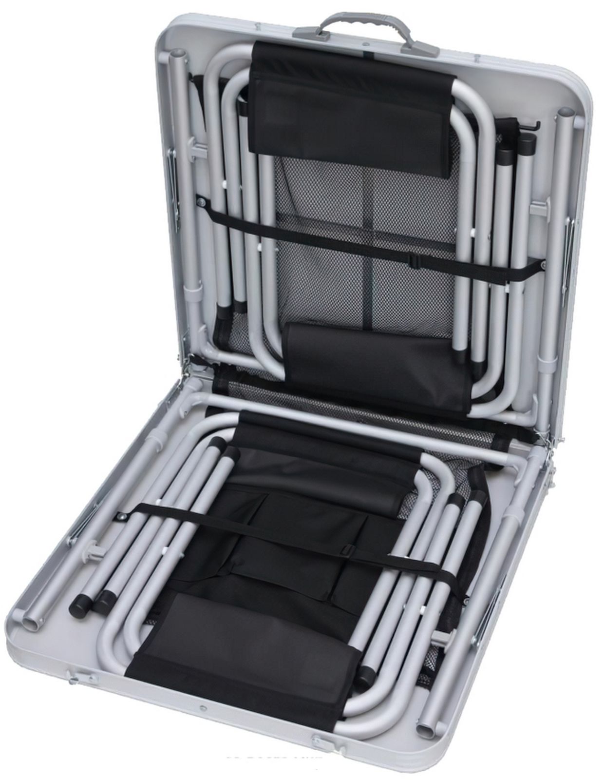 - Після пакування все чотири стільці вміщаються всередині столу, який в свою чергу складається навпіл у вигляді дипломата
