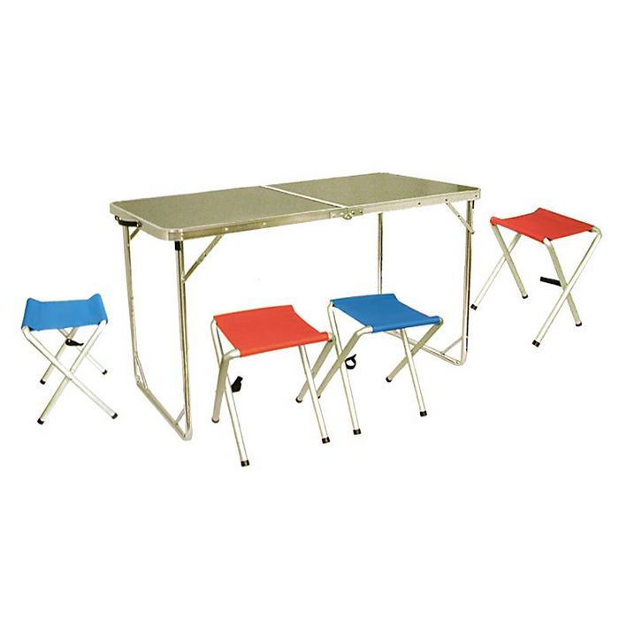У комплект меблів входить складаний стіл і чотири табурети з сидіннями з поліестеру. Стіл збільшеного розміру ідеально підходить для комфортного застілля. Висота стола регулюється по висоті в трьох положеннях (55, 60, 70 см). Оптимальний розмір стільниці і додаткові кріплення із зворотного боку збільшують міцність столу. Комплект збирається у валізку. Має додатковий чохол для транспортування, що дозволить уникнути появи зайвих подряпин і довше збереже привабливий вигляд меблів. Складається в кейс. Чохол в комплект не входить. Допустима навантаження: 30 кг для столу і 80 кг для стільців.. Розміри стільниці: 120х60х55/60/70 см. Розмір стільця: 41х36х40. Вага: 8 кг