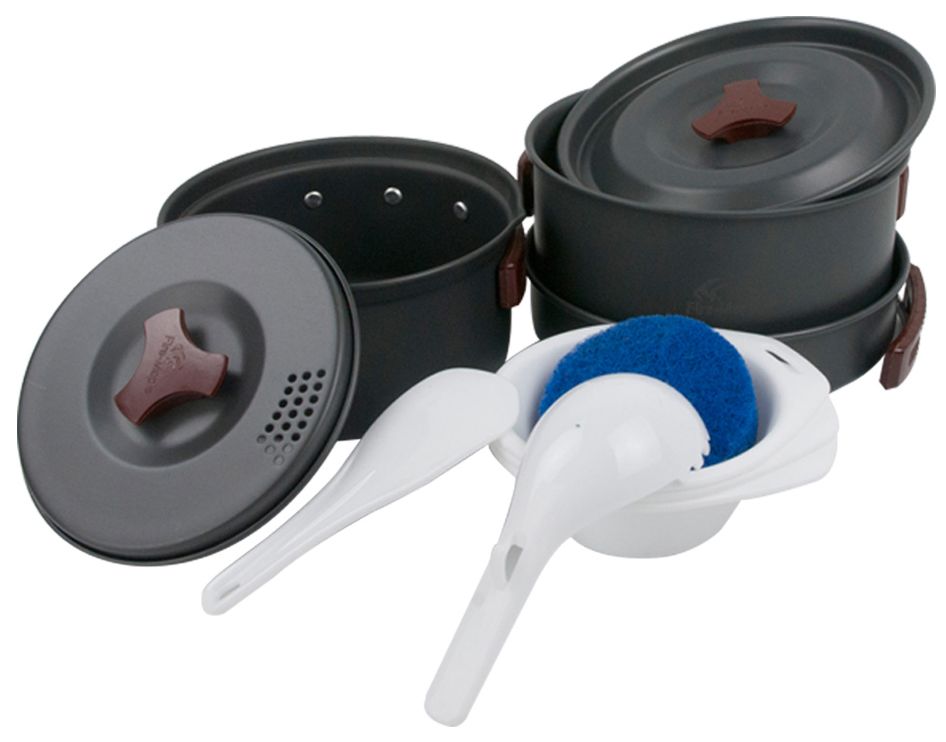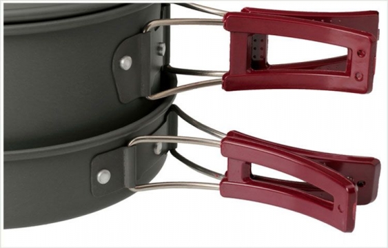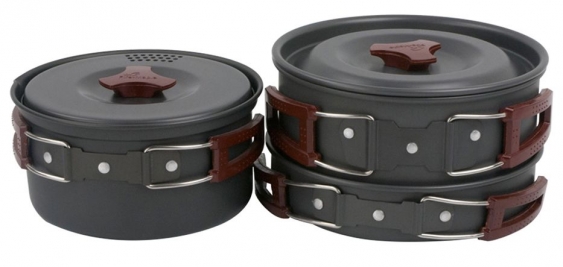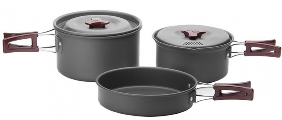Туристичний набір посуду для 2-3 осіб Fire Maple FMC-202 з анодованого алюмінію. Комплект включає в себе 1 сковороду ємністю 0,7 л, яка одночасно може служити мискою. Два казанка ємністю 1,0 л і 1,8 л відповідно з кришками, які мають зручні ручки з термопластика. Плюс 3 пластикових чашки, 1 лопатка і 1 складаний ополоник, обидва пластикові. Кожен алюмінієвий елемент набору обладнаний подвійними складаними ручками з покриттям з термопластика. Казанки по діаметру дозволяють помістити в себе стандартний різьбовий балон.