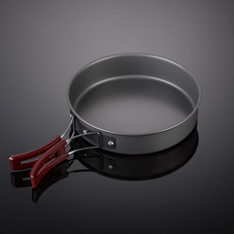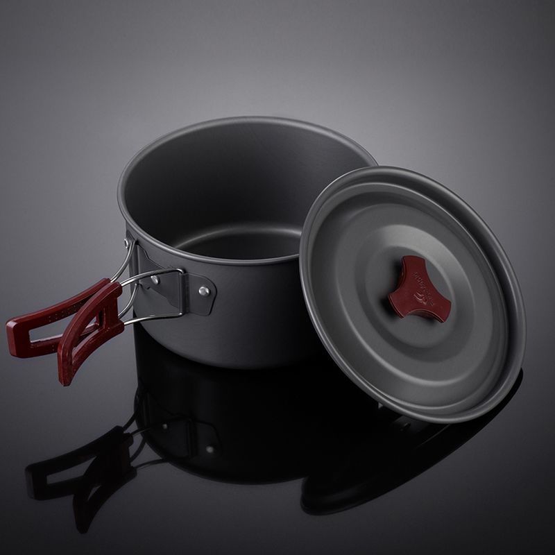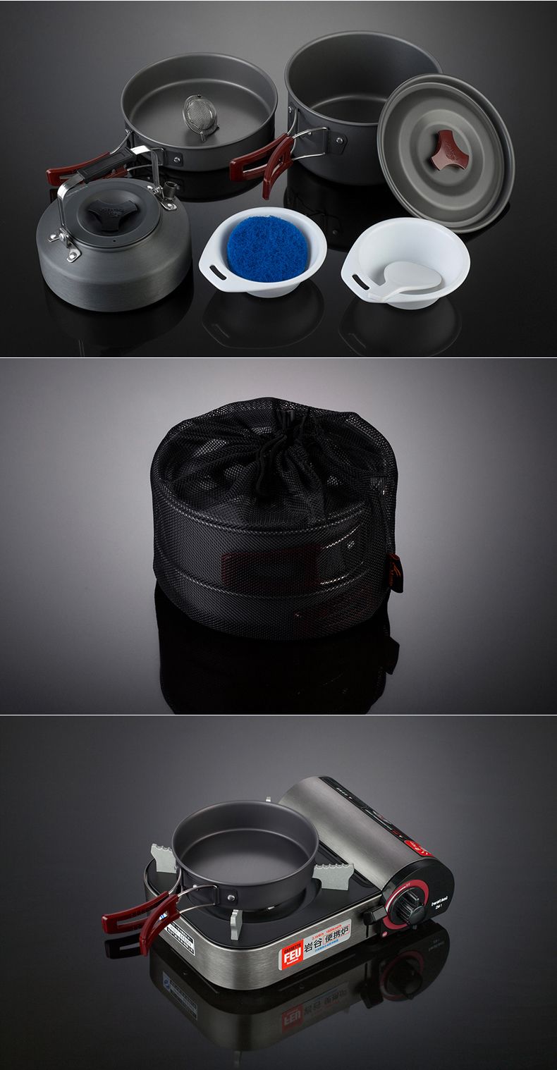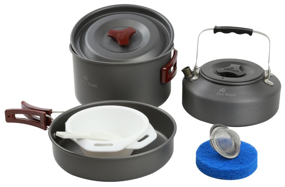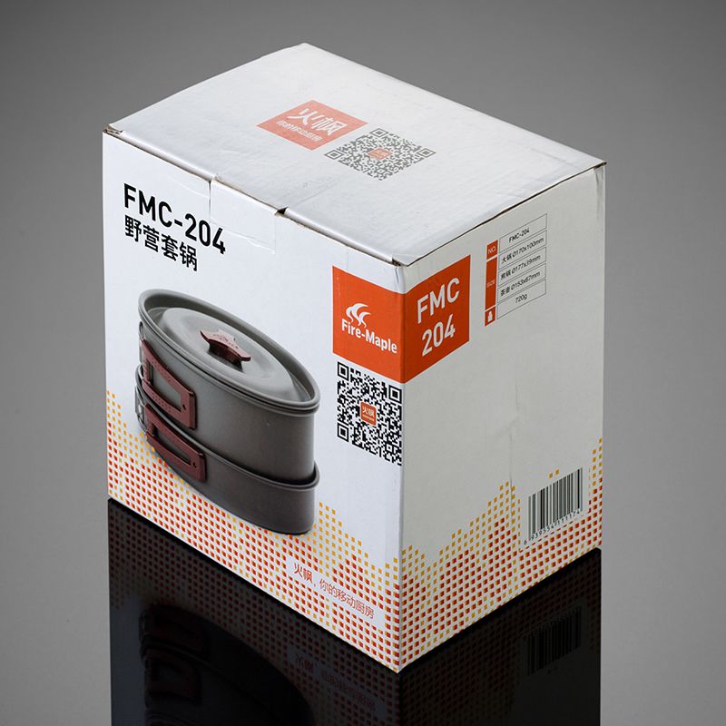 Туристичний набір посуду на 2 людини Fire Maple FMC-204 з анодованого алюмінію. Комплект включає в себе 1 сковороду ємністю 0,7 л, яка одночасно може служити мискою. Один казанок ємністю 1,8 л з кришкою, який має зручну ручку з термопластика. Чайник об'ємом 0,8 літра з ситечком. Плюс 2 пластикових чашки і 2 ложки, обидві пластикові. Кожен алюмінієвий елемент набору обладнаний подвійними складаними ручками з покриттям з термопластика. Казанки по діаметру дозволяють помістити в себе стандартний різьбовий балон.
