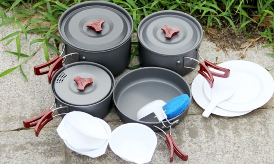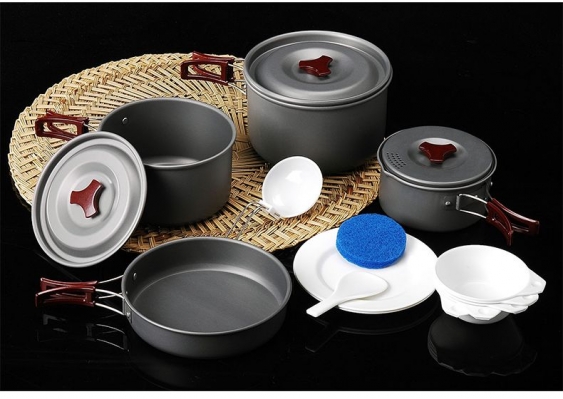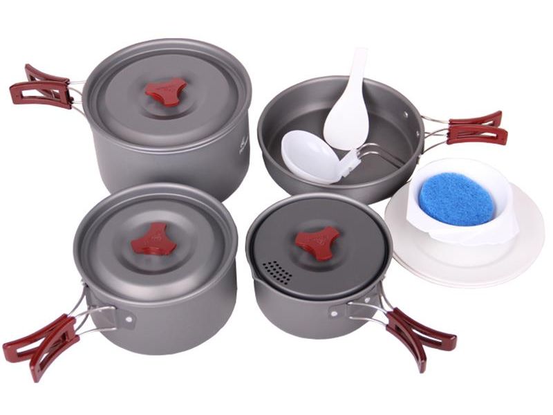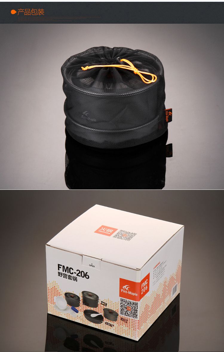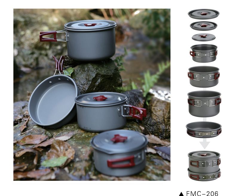 Туристичний набір посуду для 4-5 осіб Fire Maple FMC-206 з анодованого алюмінію. Комплект включає в себе 1 сковороду ємністю 1,0 літр, яка одночасно може служити мискою. Три казанка ємністю 1,1; 1,8 і 2,7 л відповідно, плюс 5 пластикових ємкостей і 2 тарілки, 1 лопатка і 1 ополоник, всі пластикові. Кожен алюмінієвий елемент набору обладнаний подвійними складаними ручками з покриттям з термопластика. Казанки по діаметру дозволяють помістити в себе стандартний різьбовий балон.