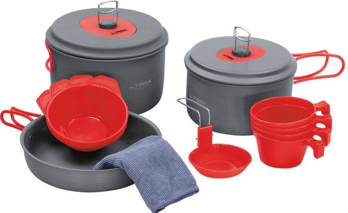 Набір похідного туристичної посуду Терра Інкогніта Кватро з анодованого алюмінію. Комплект для приготування їжі в польових умовах для трьох - чотирьох осіб. До складу входять 2 казанка з кришками і 1 сковорода, кожен з двома складними ручками. Сковорідка є також мискою. Плюс комплект пластикових мисок та кухлів, по 4 штуки кожного елемента, а також одна казанок.
