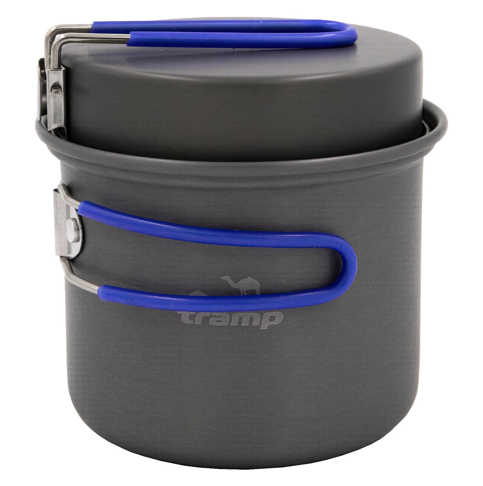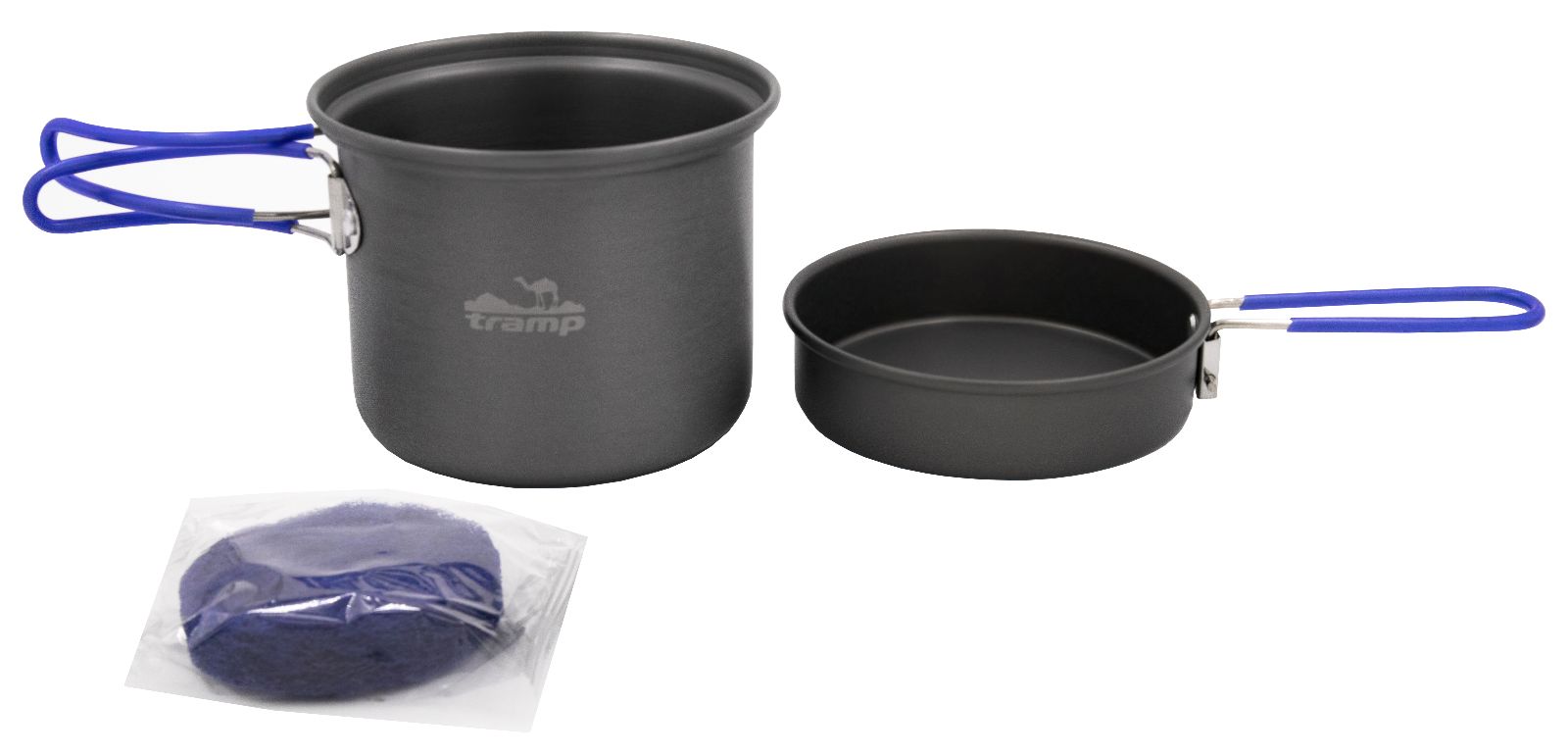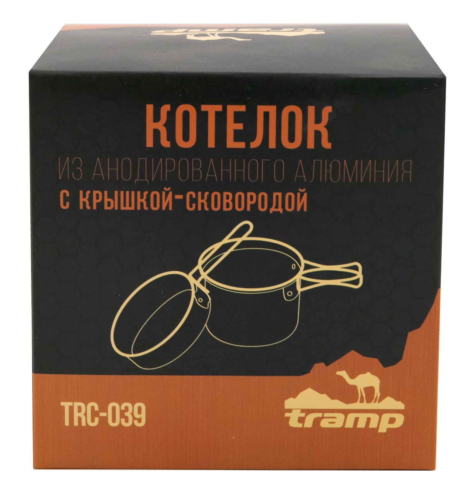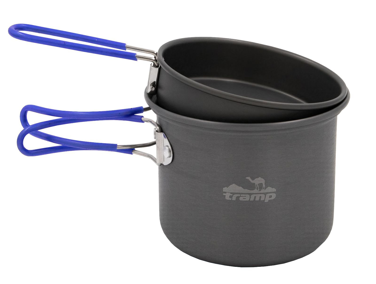 Набір посуду Tramp TRC-039 включає туристичний казанок об'ємом 0,9 літра з кришкою, яка одночасно є мискою або пательнею, комплект виготовлений з анодованого алюмінію зі сталевими рукоятками, що робить його легким та довговічним.