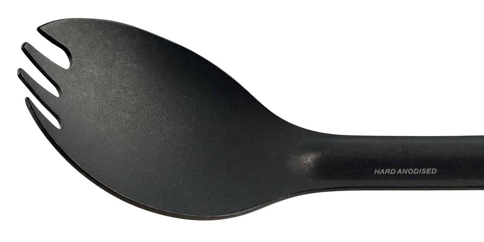 Набір столових приборів AlphaLight™ Cutlery Set 2 Spork & Knife - легке і міцне доповнення до будь-якої надлегкої похідної кухні. Набір використовує міцний анодований авіаційний алюміній у поєднанні з гладкою, але міцної формою, щоб створити надзвичайно легкий посуд. За рахунок жорсткого анодування алюмінію він утворює свого роду «екзоскелет», завдяки чому форма приладів може бути тонше і легше. Ця загартована оболонка також інкапсулює алюміній, тому немає ризику вилуговування сплаву в їжу.