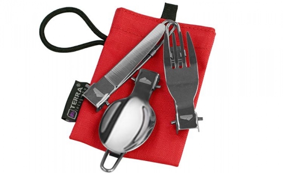 Набір складних столових приладів Терра Інкогніта Fold Set із харчової нержавіючої сталі марки 18/8. Комплект включає в себе ложку, виделку, ніж та матерчатий чохол. Довжина кожного приладу 165 мм в розкладеному стані і 95 мм в складеному вигляді.