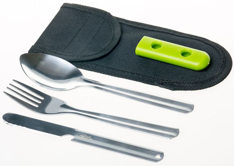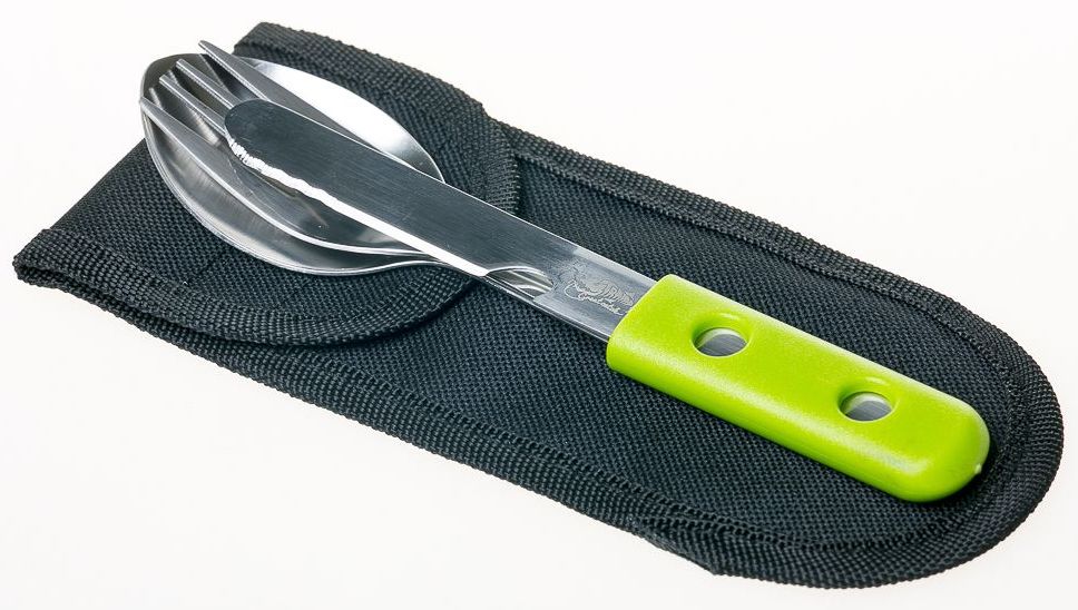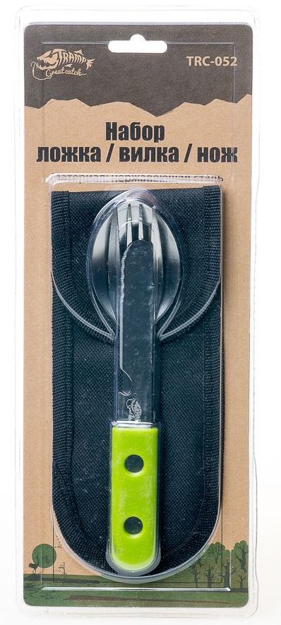 Набір столових приладів Tramp TRC-052, включає в себе велику глибоку ложку, велику вилку і ніж з открывашкой для пляшок. Всі столові прилади зроблені з харчової нержавіючої сталі, мають пластиковий футляр для спільної фіксації і пакуються в тканинний чохол.