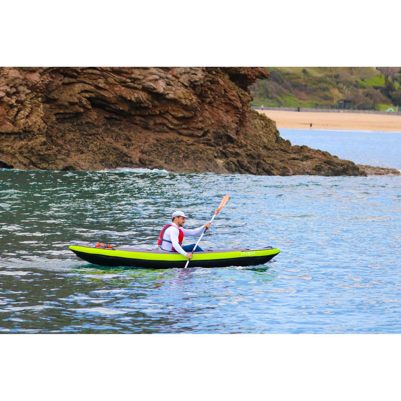 Надувний каяк ITIWIT 2 одномісний з надувними дном, двома бічними балонами і сидінням, а також з трьома знімними килями. Каяк зроблений з ПВХ тканини обшитої тканиною з Поліестеру. Підходить для прогулянок і сплавів по спокійній воді (річки, озера, прибережна лінія моря).