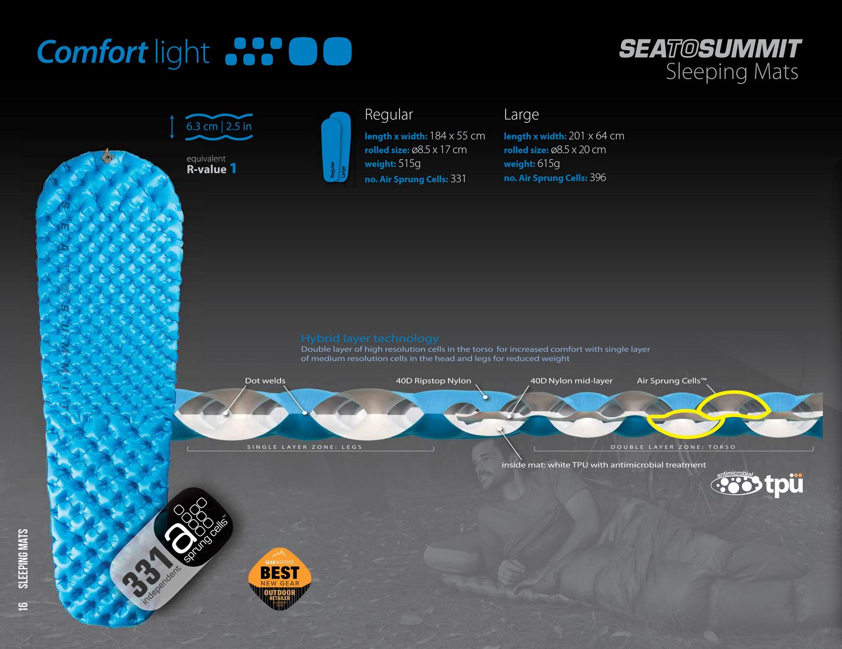 Надлегкий і компактний надувний матрац Sea To Summit Comfort Light товщиною 6,3 см і рейтингом теплоізоляції - R1. Це самий сучасний, найбільш досконалий і оптимальний варіант килимка під спальник (у співвідношенні вага до обсягу і до комфорту) для туристичних піших або вело походів, коли вага носимой екіпіровки має величезне значення. Завдяки технології Air Sprung Cells з гібридним шаром, який представляє собою ямочную поверхню з 331 взаємопов'язаних надвуных клітинок або камер, де двошарові осередки розташовані в районі тулуба для максимального комфорту та ізоляції, а одношарові осередки знаходяться в районі голови і ніг для зниження ваги. Така чарункова структура, дозволяють килимка пристосовуватися до нерівностей спального місця і форм вашого тіла, а також швидко надуватися і здуватися, і при цьому дуже щільно складатися.