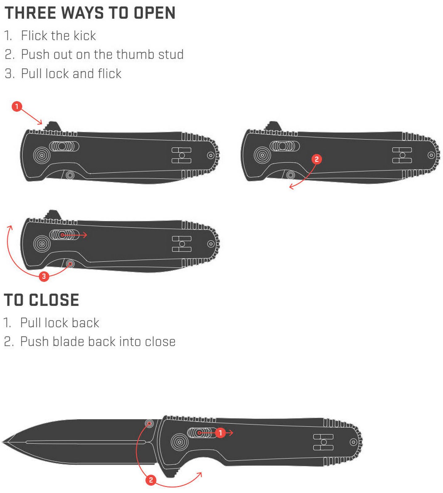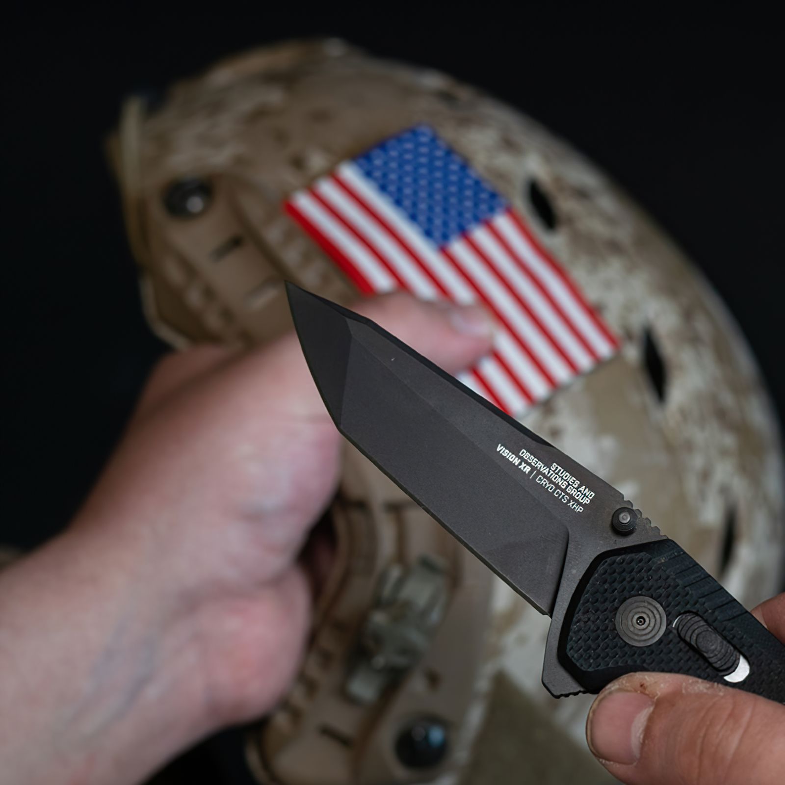 Замок XR - XR Lock® від SOG забезпечує плавне і контрольоване відкривання однією рукою, за допомогою передбаченого отвори для великого пальця в лезі, або утримуючи замок і викидаючи рухом кисті лезо. Забезпечує максимальну вбудовану безпеку блокування леза у відкритому стані, здатну витримати зусилля в 680 кг.