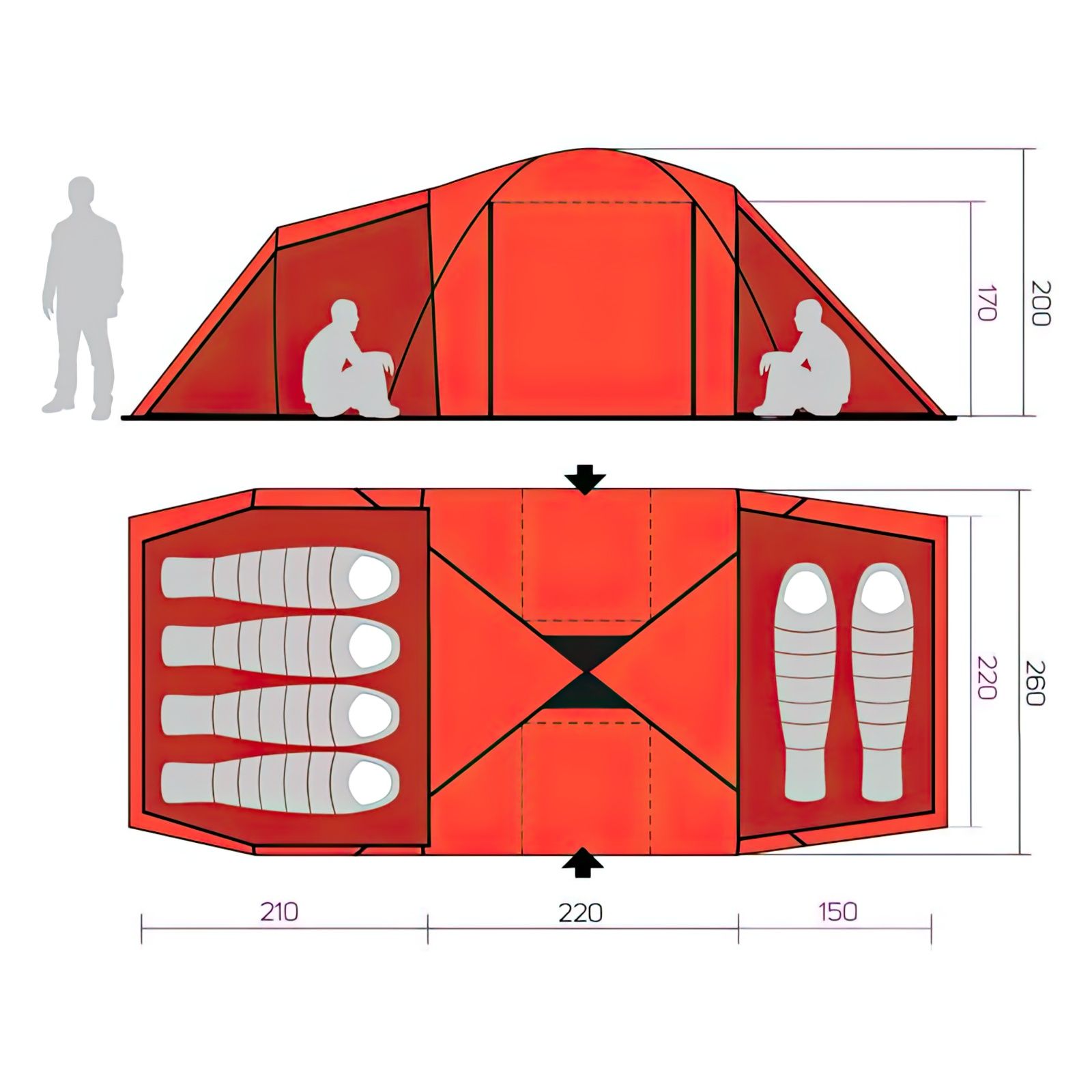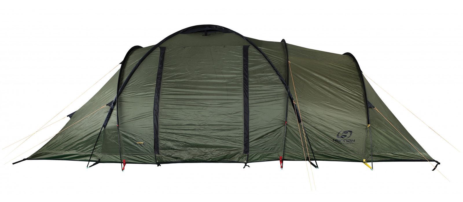 Просторий шестимісний кемпінговий намет Hannah Spirit 6 для сім'ї або групи друзів. Стійкий зовнішній дюрапольовий каркас з п'яти дуг, два входи і один величезний повноростний тамбур заввишки 200 см, входи в тамбур і в житлові відсіки продубльовані антимоскітною сіткою, інтегрована підлога по всій поверхні намету, 4 вентиляційних отвори, а в житлових відсіках яких повністю відчиняються двері з частковою вентиляцією. Високий комфорт для вимогливих користувачів, намет виготовлений із міцних матеріалів та відмінно підійде для трисезонного використання.