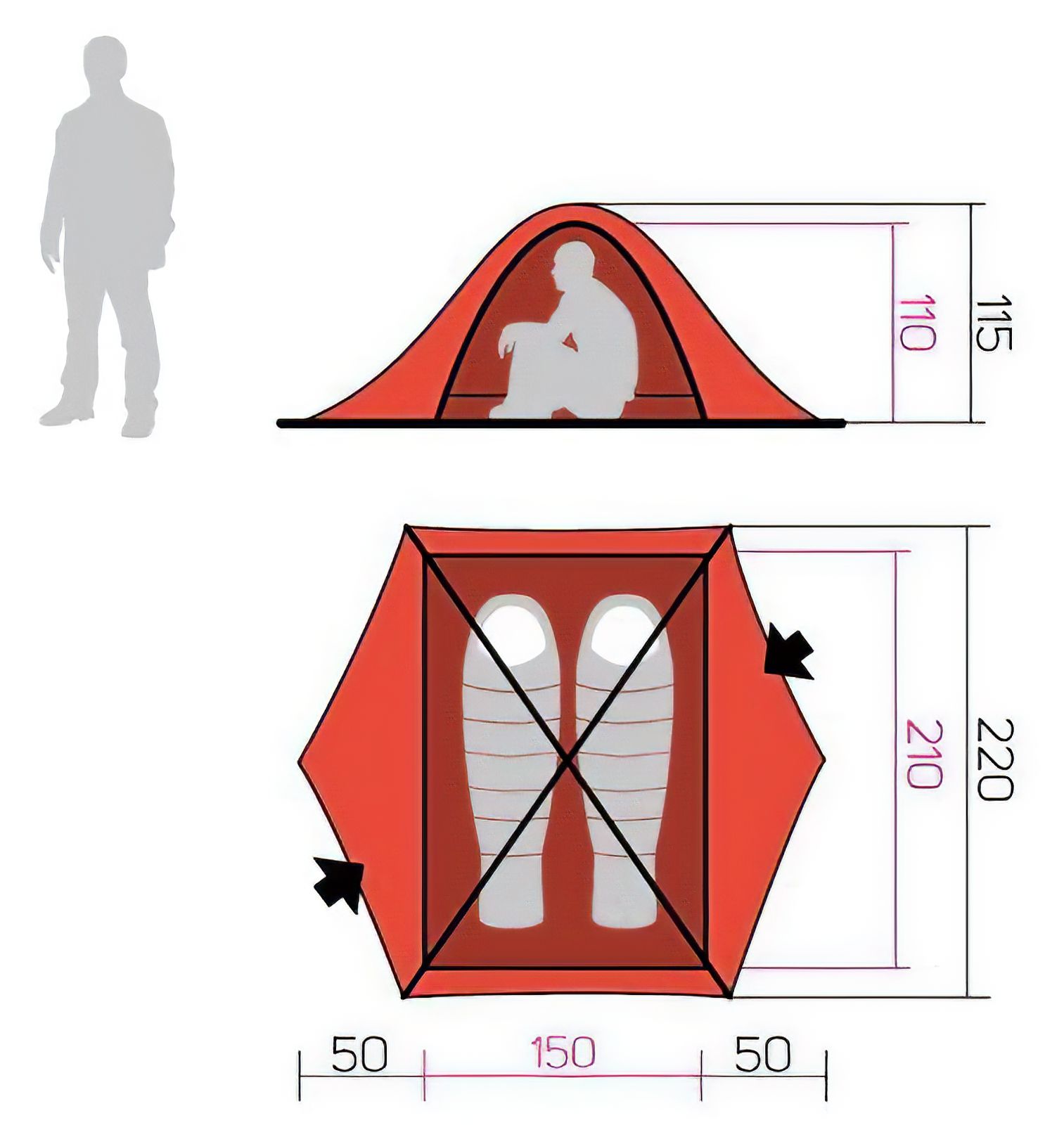 За рахунок класичної компоновки, ви можете дуже швидко і легко встановити даний намет, буквально за 1,5-2 хвилини. Просто кидаєте на землю внутрішній намет в розкладеному вигляді, збираєте обидві дуги і встановлюєте їх хрест на хрест у відповідні отвори по кутах намету. Піднімаємо дуги і підчипляємо за них знизу намет за допомогою спеціальних пластикових гачків - все намет практично зібрано, вже в такому стані їм можна користуватися, якщо ви звичайно знаєте, що не буде дощу та/або сильного вітру. Для остаточного складання достатньо лише накинути зверху тент, розтягнути відтяжки і закріпити кілочки в землю.
