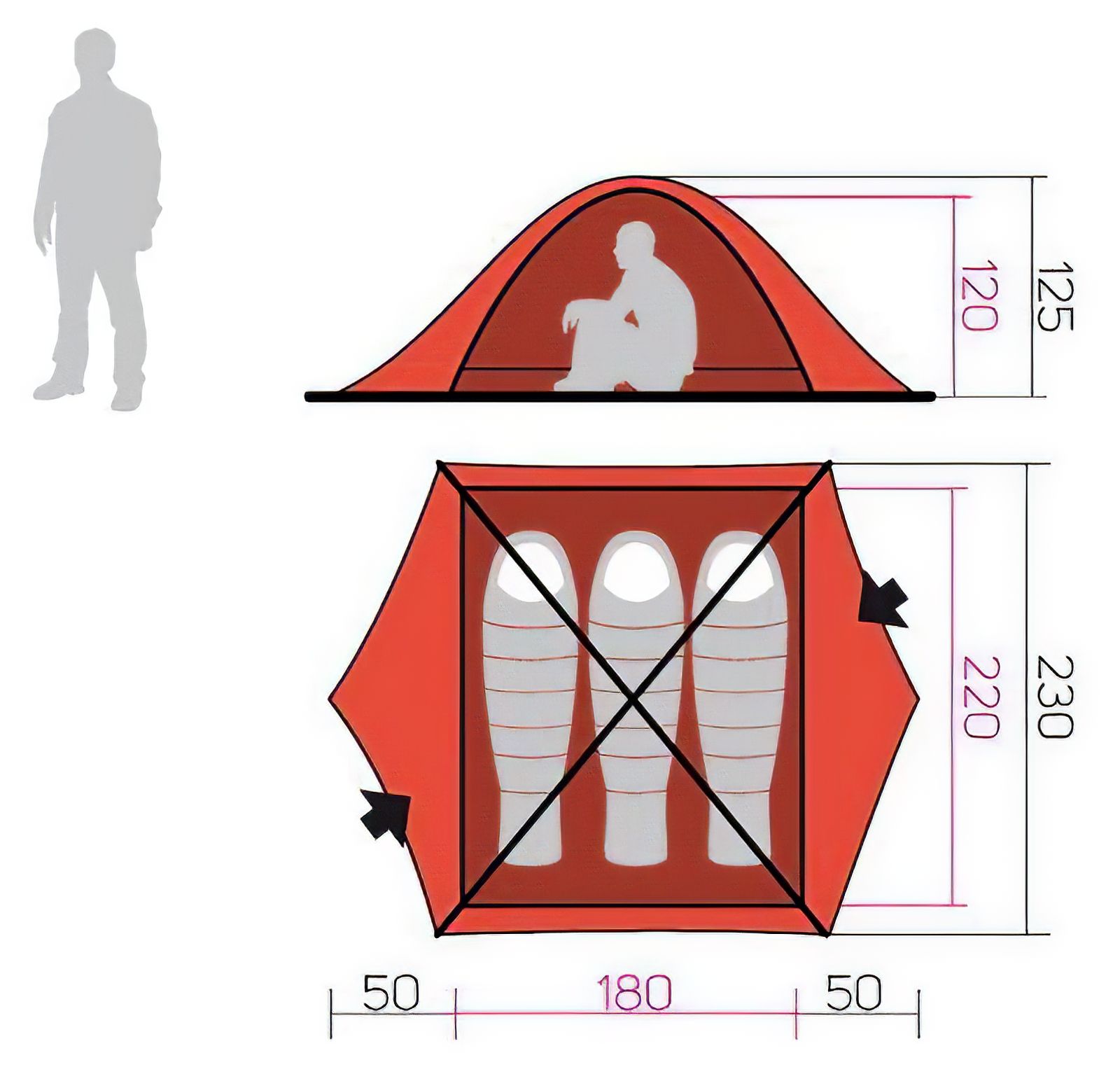 внутрішній намет з дюралюмінієвим каркасом, двома дугами і закріпленим зверху зовнішнім тентом;