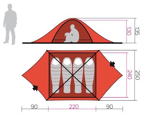 За рахунок класичної компоновки, ви можете дуже швидко і легко встановити даний намет, буквально за 1,5-2 хвилини. Просто кидаєте на землю внутрішній намет в розкладеному вигляді, збираєте обидві дуги і встановлюєте їх хрест на хрест у відповідні отвори по кутах намету. Піднімаємо дуги і підчипляємо за них знизу намет за допомогою спеціальних пластикових гачків - все намет практично зібрано, вже в такому стані їм можна користуватися, якщо ви звичайно знаєте, що не буде дощу та/або сильного вітру. Для остаточного складання достатньо лише накинути зверху тент, розтягнути відтяжки і закріпити кілочки в землю.