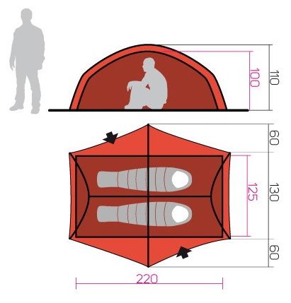 Два тамбура формуються елементами каркаса з двома входами захищеними антимоскітними сітками, внутрішня верхня частина намету зроблена з сітки з двома вентиляційними вікнами на блискавках, що в комбінації забезпечує просто відмінну вентиляцію. По дві кишені в голові і ногах намету.