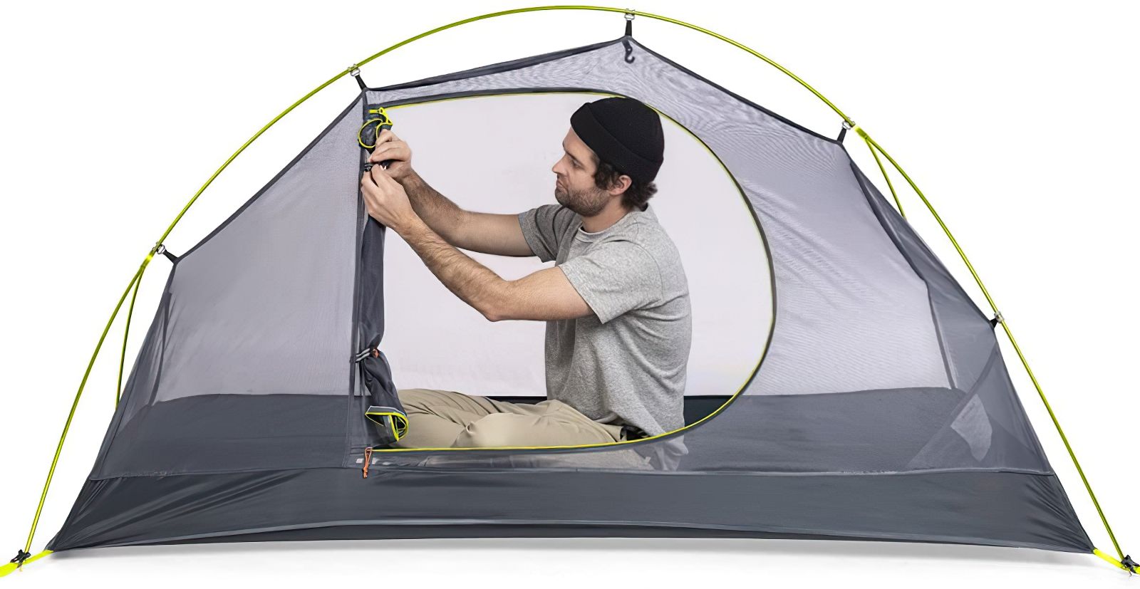 Зовнішній тент обладнаний одним входом на блискавці до тамбуру, оснащений двома вентиляційними вікнами з обох торців намету