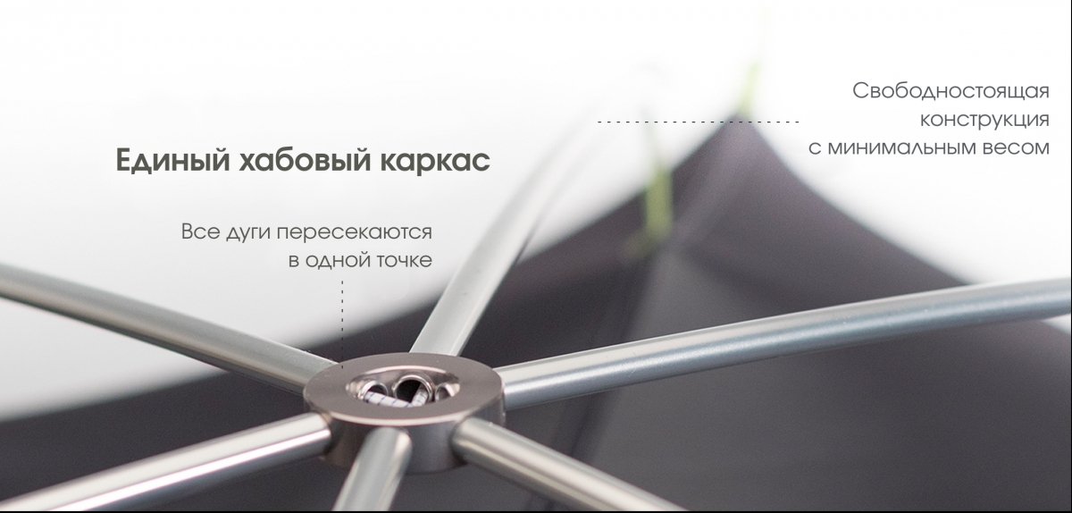 Свободностоящая хабовая конструкція каркасу забезпечує швидку установку, великий простір основний намети і тамбурів, а також вітростійкість.