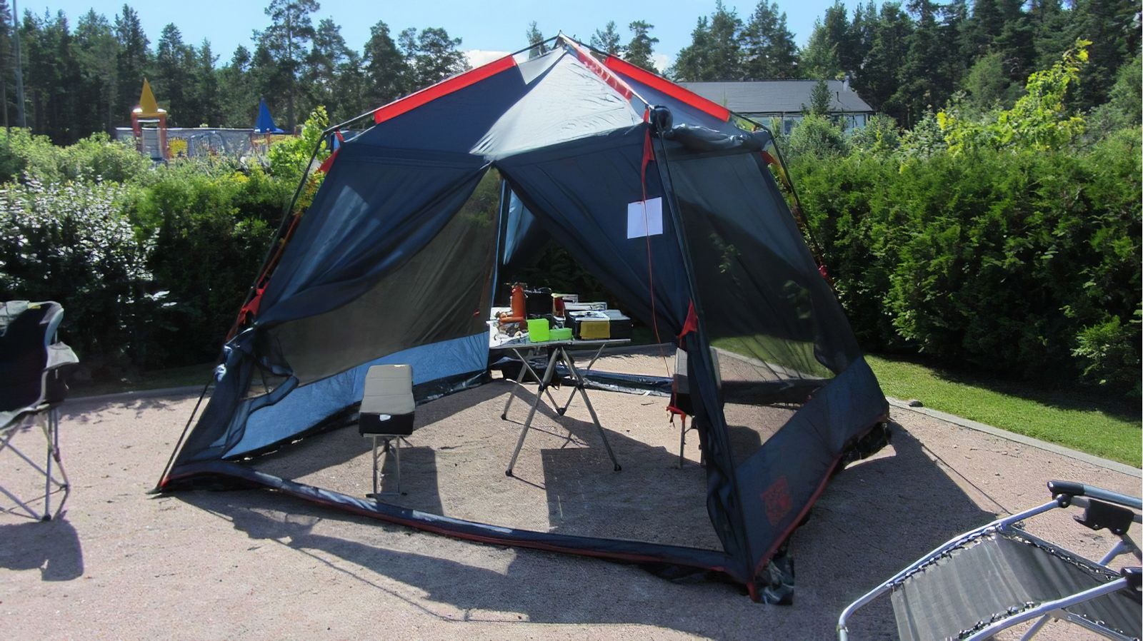 Два входа в намет, розташовані один навпроти одного, входи захищені основною тканиною і антимоскітними сітками, все обладнані блискавками і дозволяють розкрити намет на всю ширину межі, на ребрах намети є спеціальні кріплення для матеріалу вхідних дверей