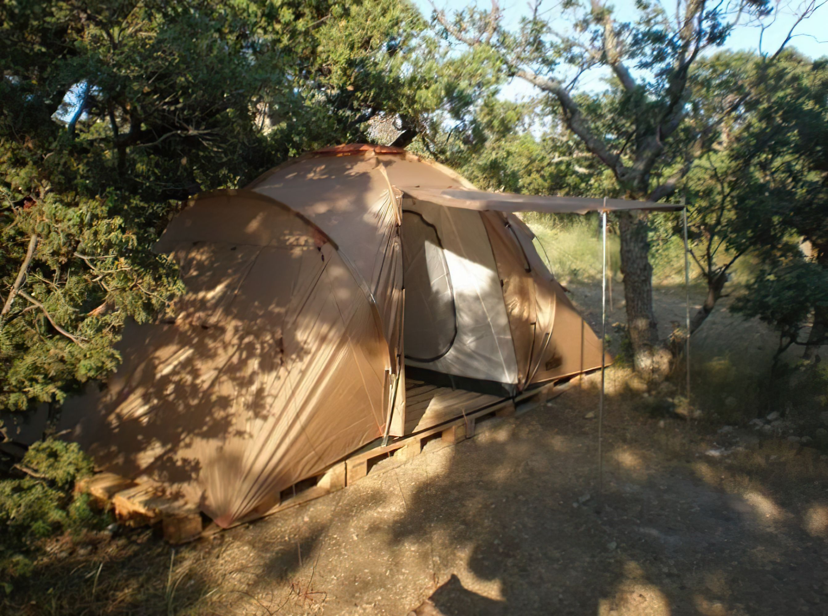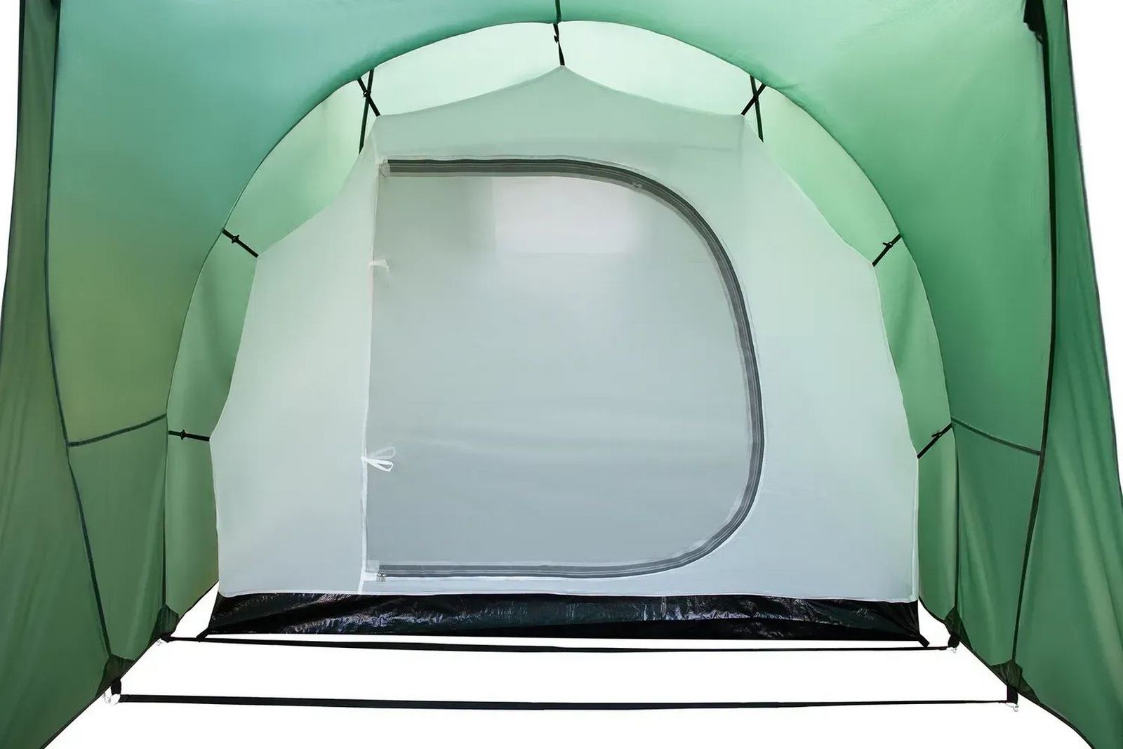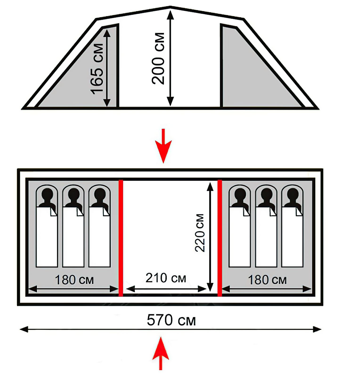 - Двокімнатна комплектація намету, кожен з двох житлових відсіків розмірами 2,20 на 1,80 м і висотою до 1,65 метра