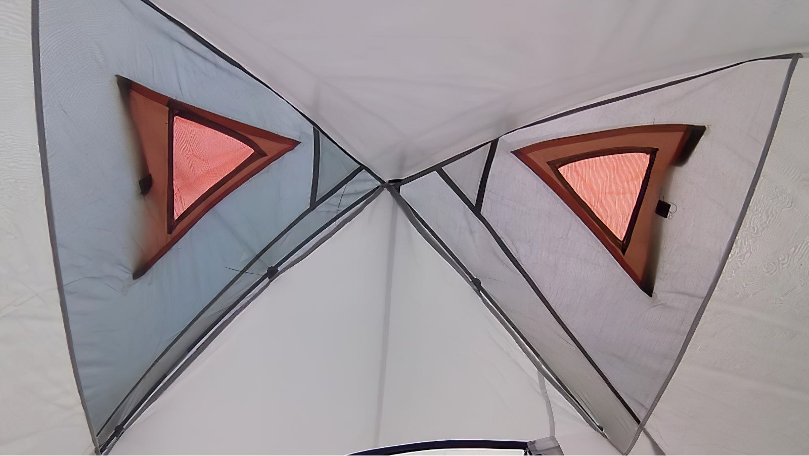 - Вентиляція здійснюється через вхідні двері в намет і через антимоскітну сітку під куполом
