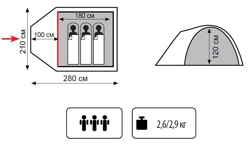 - Первісна установка внутрішнього намету за допомогою 2 дуг з подальшим накиданням тенту згори і формуванням тамбура окремою дугою, яка встановлюється в пази в самому тенті