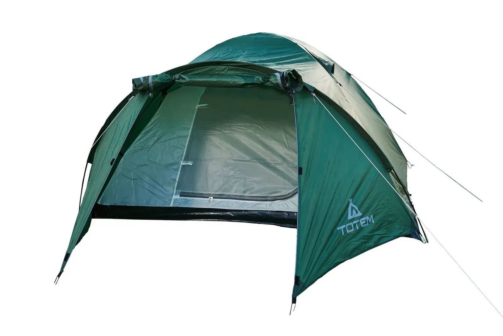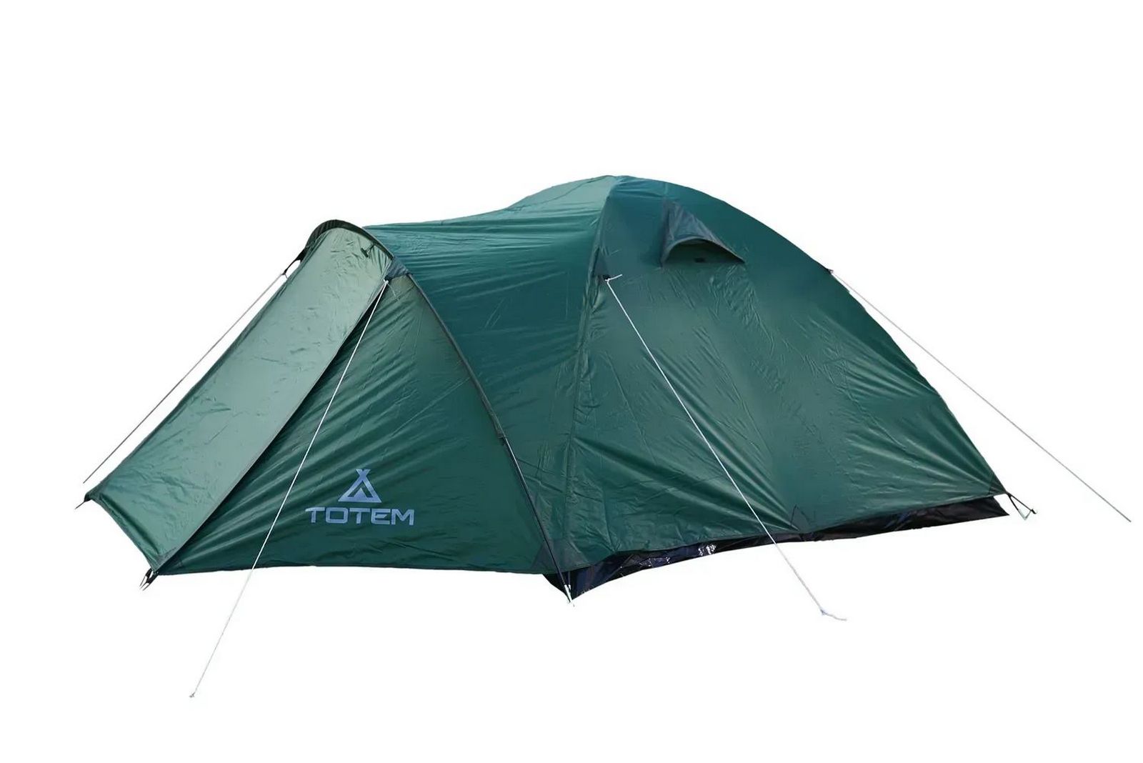 Універсальний всесезонний чотиримісний двошаровий туристичний намет Тотем Indi 3 v2 з фібергласовим каркасом з трьох дуг, одним тамбуром і одним входом захищеним антимоскітної сіткою, всі шви тенту проклеєні для максимальної водостійкості, два вентиляційних клапана.