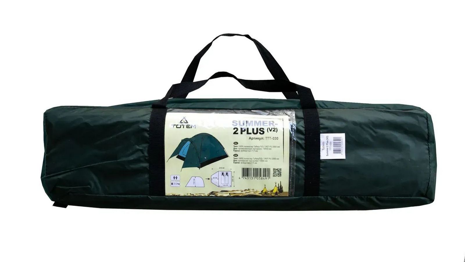 Двомісний одношаровий туристичний намет Totem Summer 2 Plus (v2) з фібергласовим каркасом з трьох дуг, з одним тамбуром і одним входом у житловий відсік, захищений антимоскітною сіткою. Всі тентові шви проклеєні для максимальної водостійкості, а для вентиляції є сітчасті вікна вгорі в куполі намету. Варіант для нетривалих походів вихідного дня та відпочинку на природі.