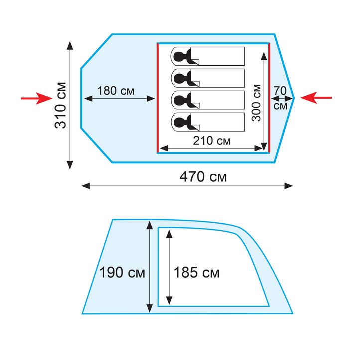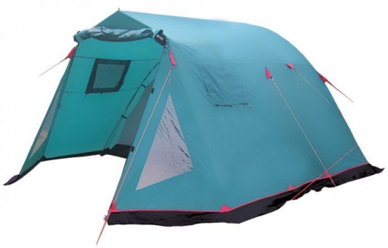 Кемпінговий чотиримісна двошарова туристичний намет Tramp Baltic Wave. Полноростная намет висотою до 1,90 м з спідницею, дюраполевый каркас з трьох дуг і двох стійок, великий тамбур зі з'ємним підлогою з армованого поліетилену і навісом зі стійками, два входи захищених антимоскітними сітками, всі шви намету проклеєні для максимальної водостійкості, два великих вентиляційних вікна.