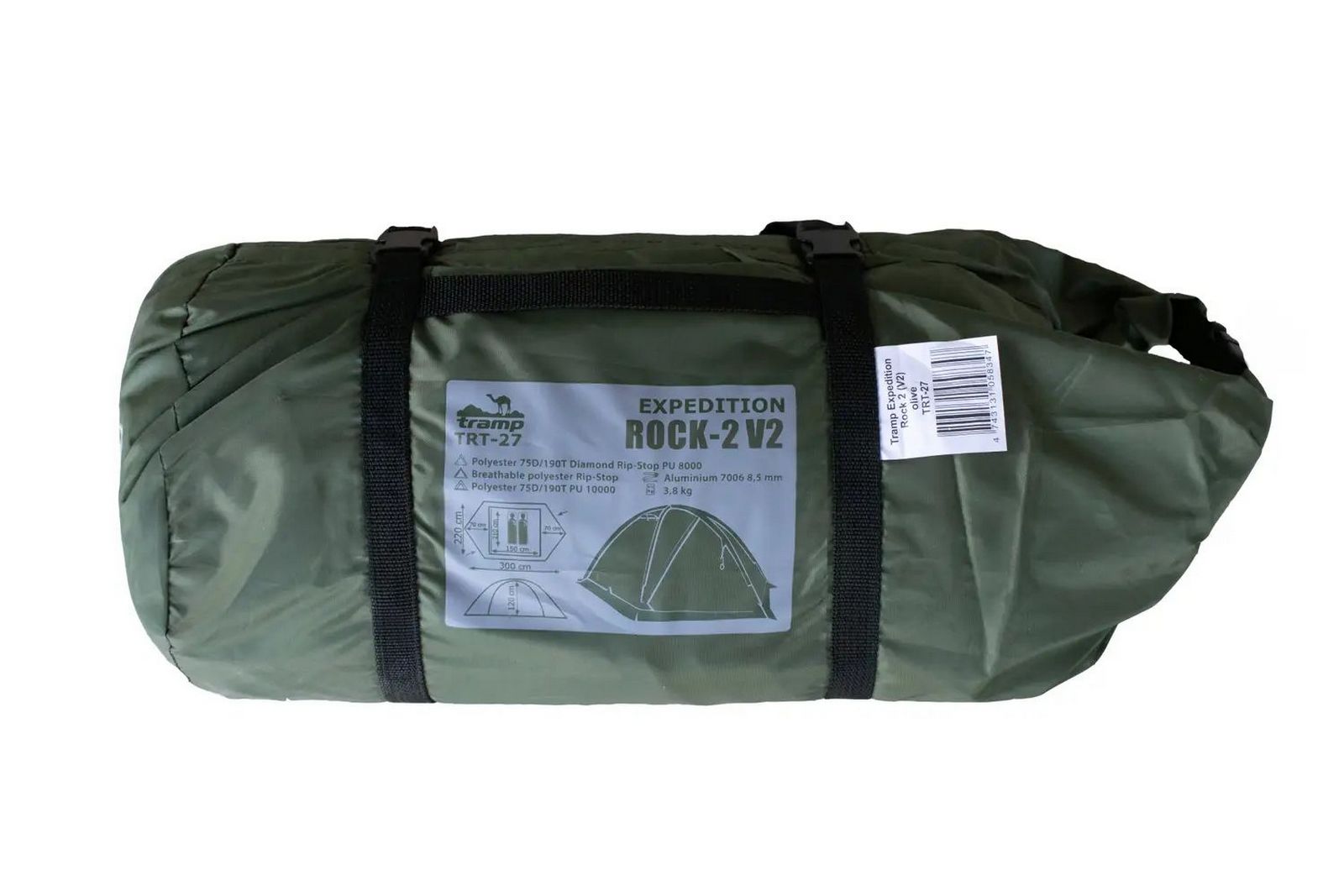 Універсальний всесезонний двошаровий двомісний туристичний намет Tramp Rock 2 v2 оновлена версія 2019 року. Легкий з дюралюмінієвим каркасом з трьох дуг, двома тамбурами, двома входами захищеними антимоскітною сіткою кожен, всі шви тенту проклеєні для максимальної водостійкості, тент стійкий до ультрафіолету і має антипіренну просочення, що захищає від поширення вогню, два вентиляційні клапани. За рахунок зовнішнього каркаса намет можна використовувати просто як тент без внутрішньої житлової частини, це дуже зручно, якщо необхідно швидко стати табором і сховатися від дощу або сонця.