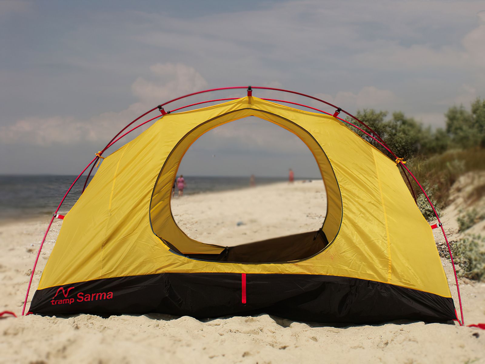 Універсальний всесезонний двошаровий двомісний туристичний намет Tramp Sarma 2 v2 оновлена версія 2019 року. Легкий з дюралюмінієвим каркасом з двох дуг, двома тамбурами, двома входами захищеними антимоскітними сітками кожен, всі шви тенту проклеєні для максимальної водостійкості, два вентиляційні клапани та снігова спідниця. За рахунок оригінальної конструкції несучого каркаса при якому дуги перетинаються у двох точках, намет має покращену стійкість до сильного вітру, снігу та дощу.