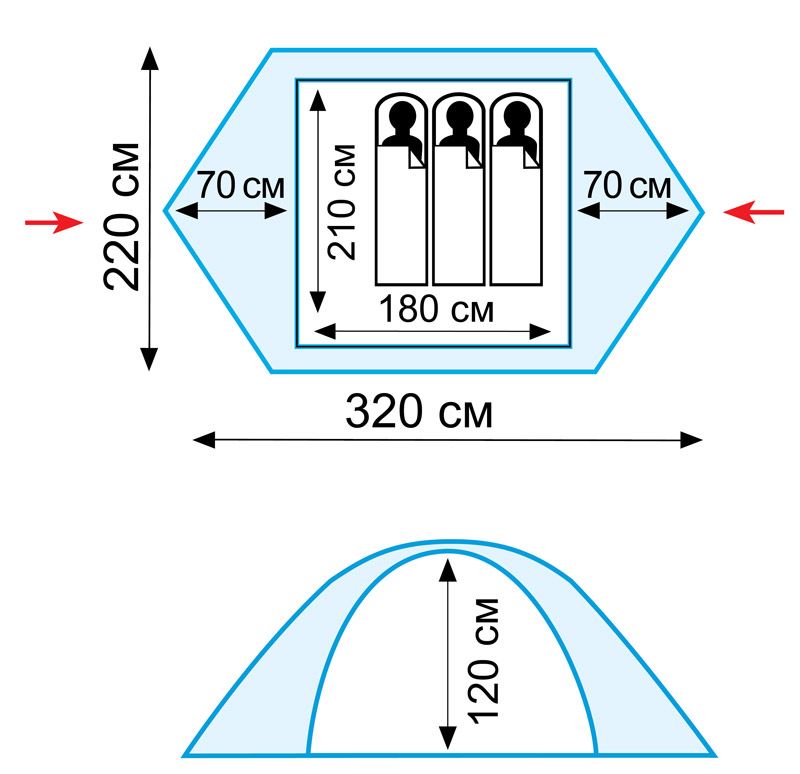 Намет має тамбур (можна залишати рюкзаки, взуття, інвентар, не захаращуючи внутрішній простір), два входи і два вентиляційних клапана з антимоскітними сітками. Водонепроникність намети - на високому рівні: тент - UV FP 6000 мм, дно - PU 8000 мм При покупці в комплекті йдуть кілька шматочків тканини тенту, дна і внутрішнього відділу, кілочки з алюмінію і 4 вітрозахисні відтяжки.