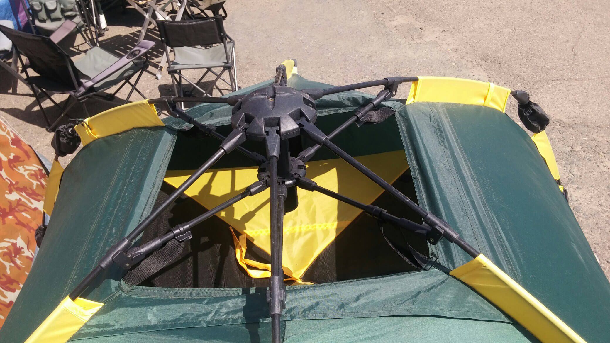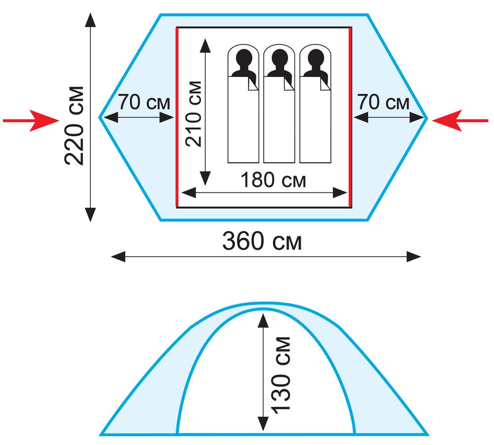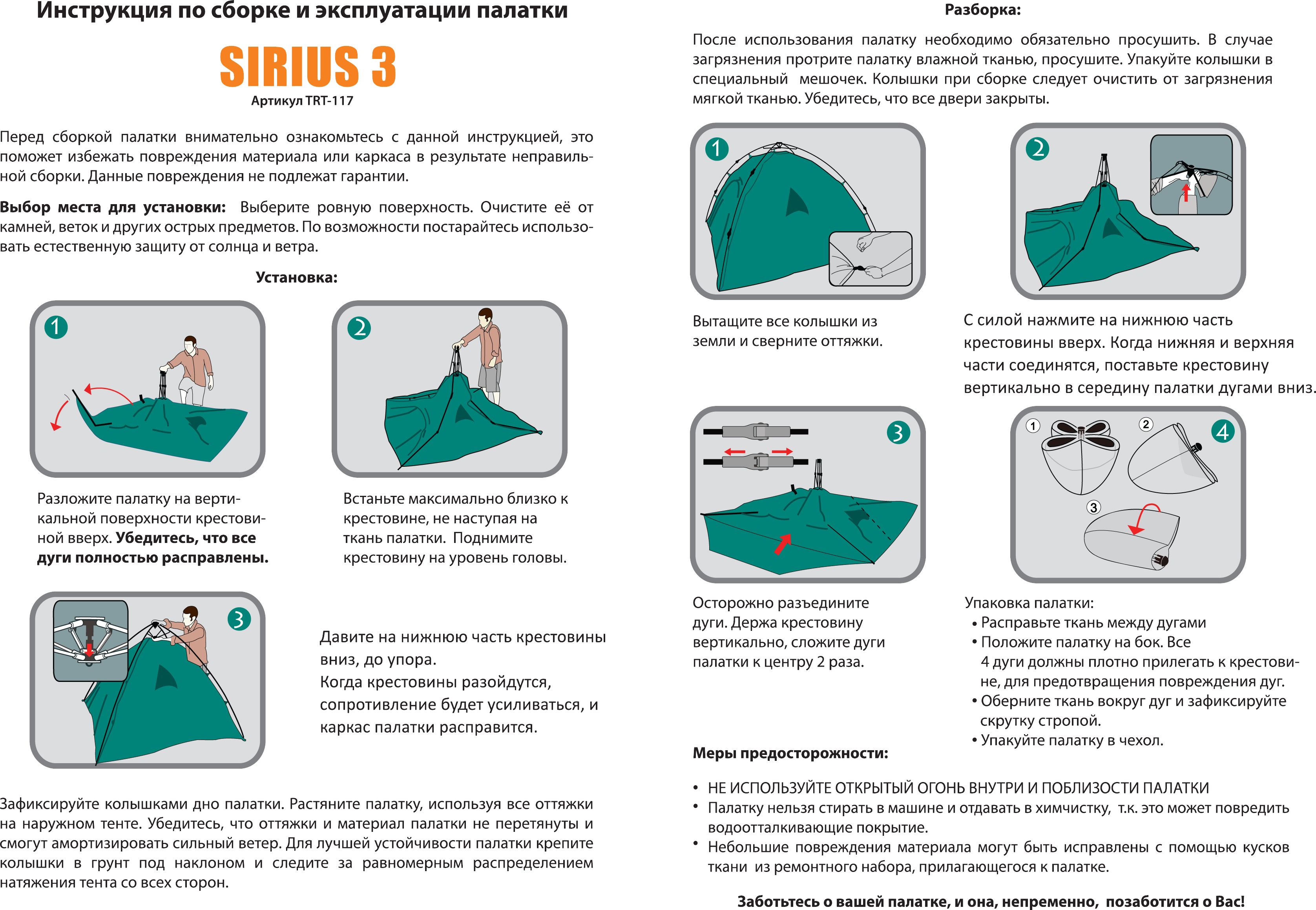 Тримісна быстроустанавливаемая намет з автоматичним каркасом Трамп Sirius 3. Класична купольна форма для максимально швидкого встановлення, зовнішній складаний фібергласовий каркас з двох основних дуг і однієї уокороченной дуги для тамбурів, два тамбури і два входи захищених антимоскітними сітками кожен, всі шви намету проклеєні для максимальної водостійкості, антипиренная просочення тенту для запобігання поширення вогню, великий вентиляційний клапан на вершині намети. Відмінний варіант для автотуристів, кому необхідно швидко і просто стати лагером в кемпінгу.