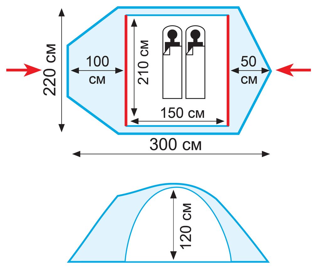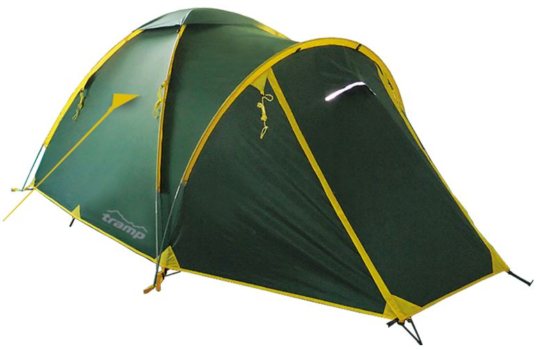 Універсальна двошарова двомісний туристичний намет Трамп Space 2 v2. Класична купольна форма житлового відсіку для максимально швидкої установки в поході, зовнішній дюраполевый каркас з трьох дуг, один великий тамбур і два входи захищених антимоскітними сітками кожен, всі шви намету проклеєні для максимальної водостійкості, два вентиляційних клапана. За рахунок зовнішнього каркаса намет можна використовувати просто як тент без внутрішньої житлової частини, це дуже зручно, якщо необхідно швидко стати табором і сховатися від дощу або палючого сонця.