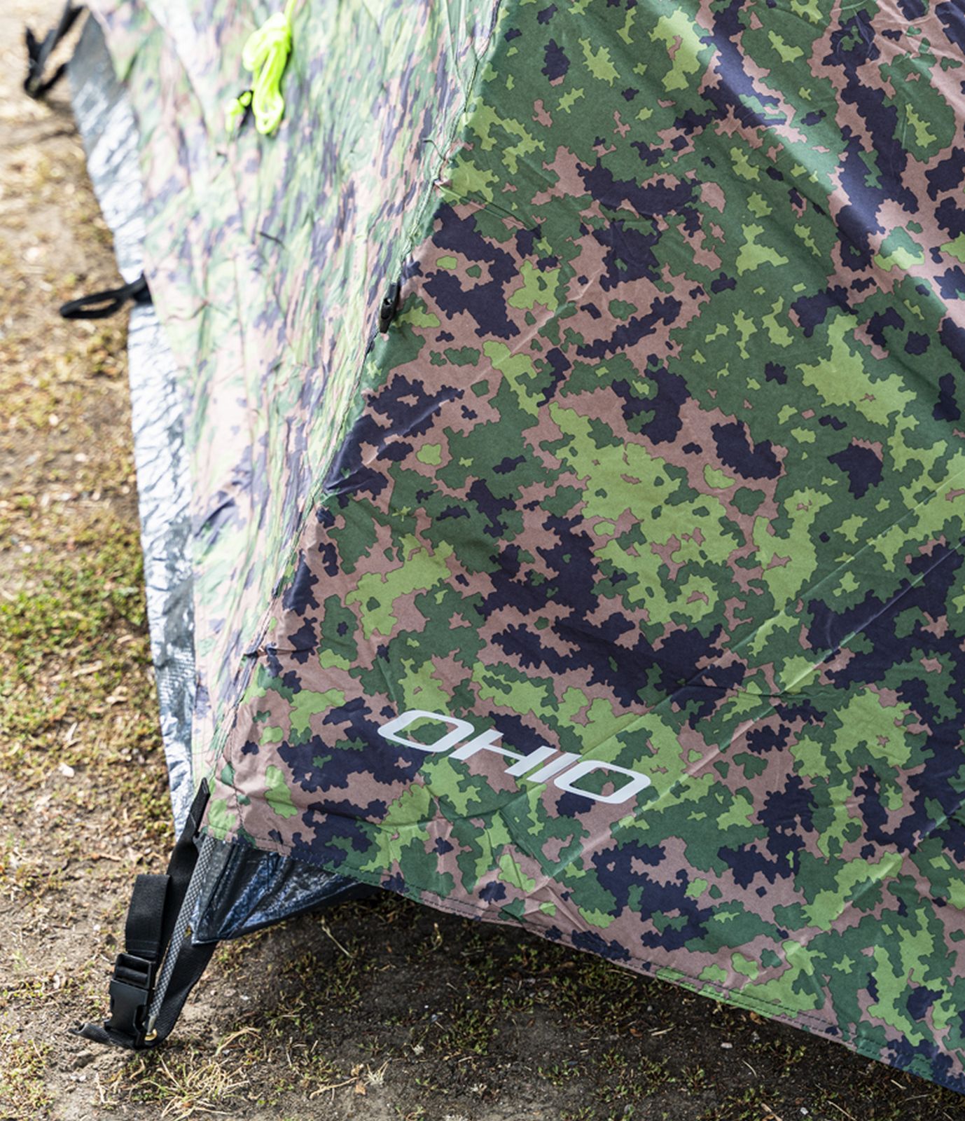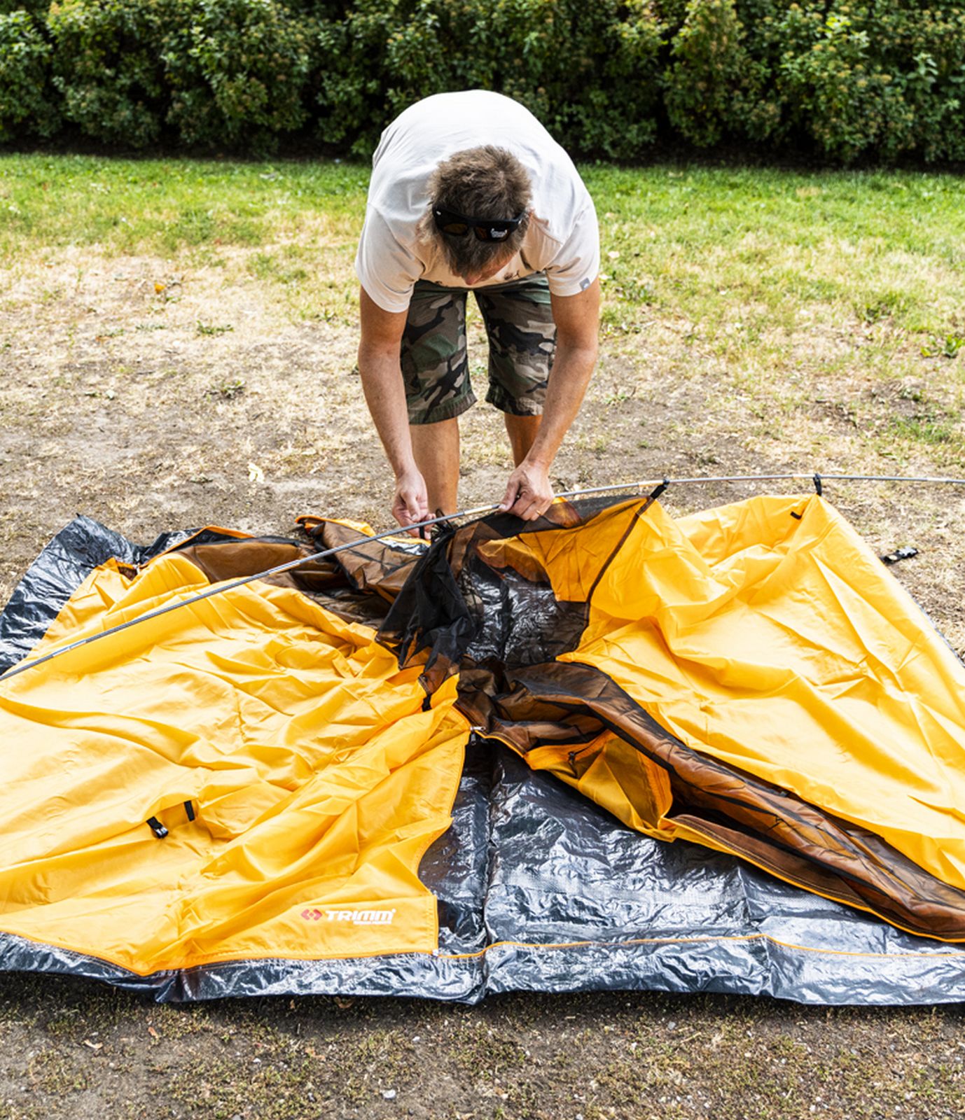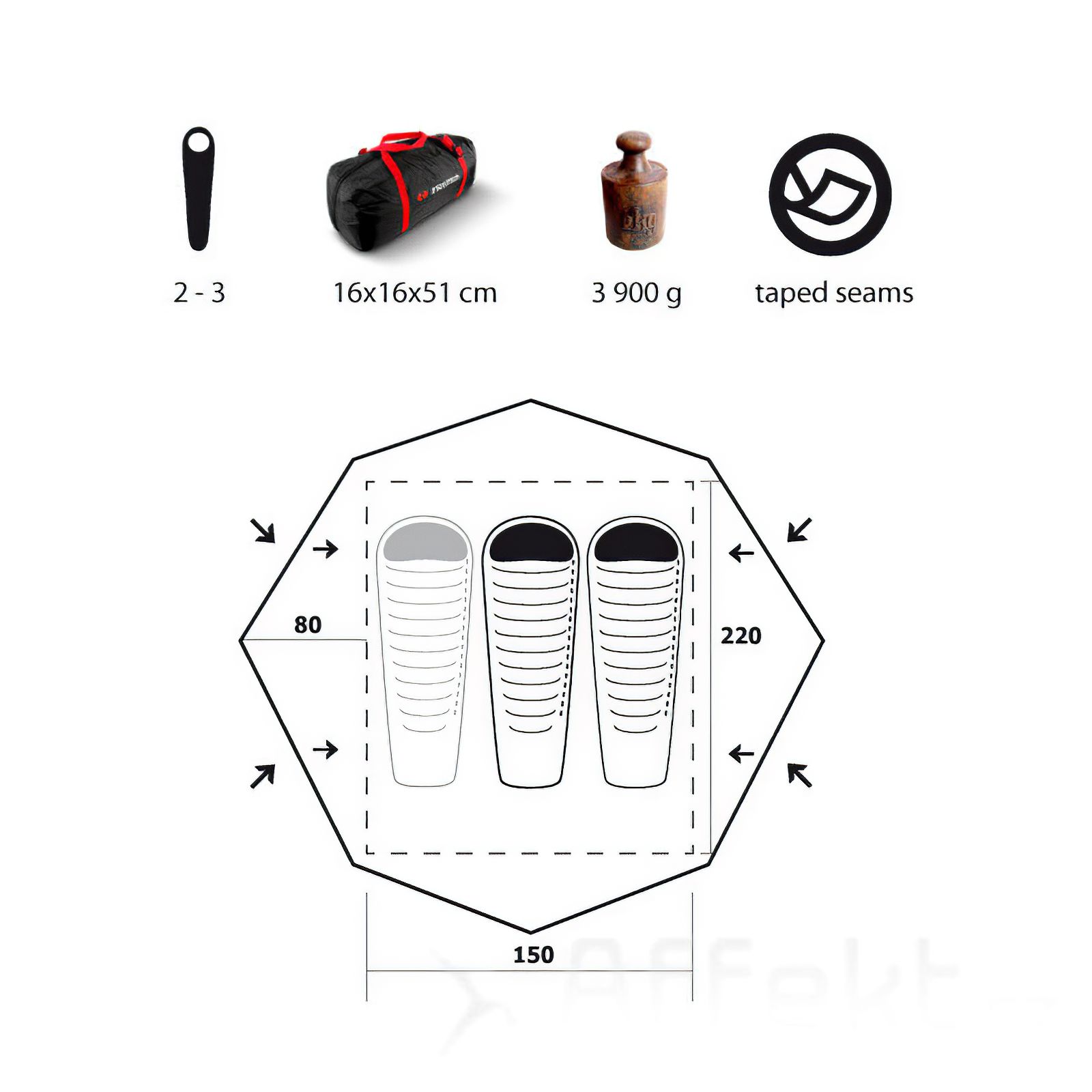 Намет для 2-3 осіб з двома входами. Два тамбури забезпечують достатньо простору для багажу. Двухдуговая конструкція забезпечує стійкість до поривів вітру. Третя маленька дуга призначена для збільшення тамбурів.