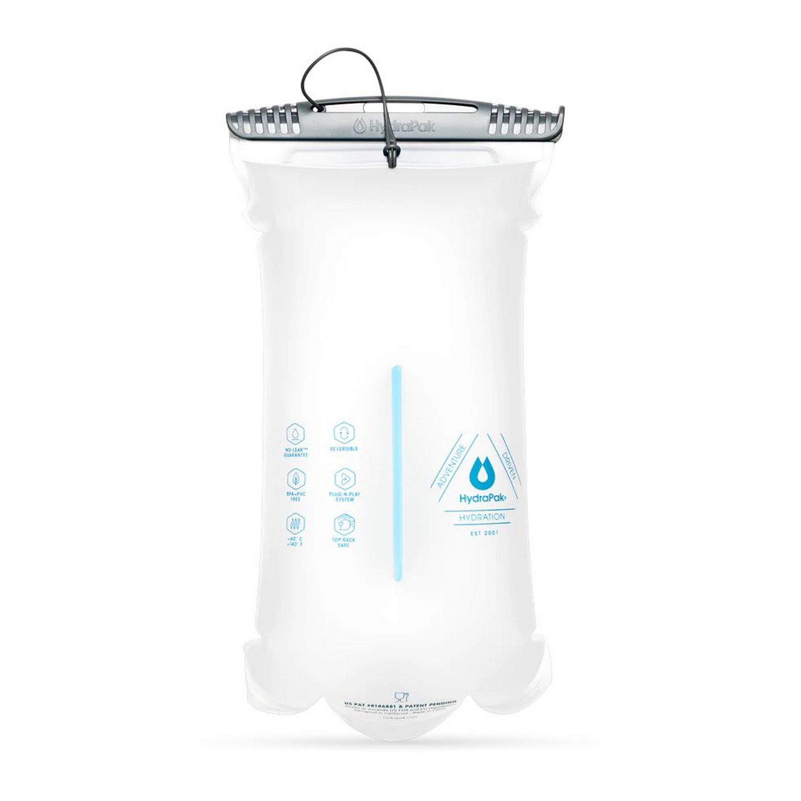 - Центральна перегородка працює за принципом застібки на ziplock-пакет: застебніть її для підтримки плоскої форми гідратора (обсяг становить 1,5 л), або розкрийте для максимальної місткості (2 л).