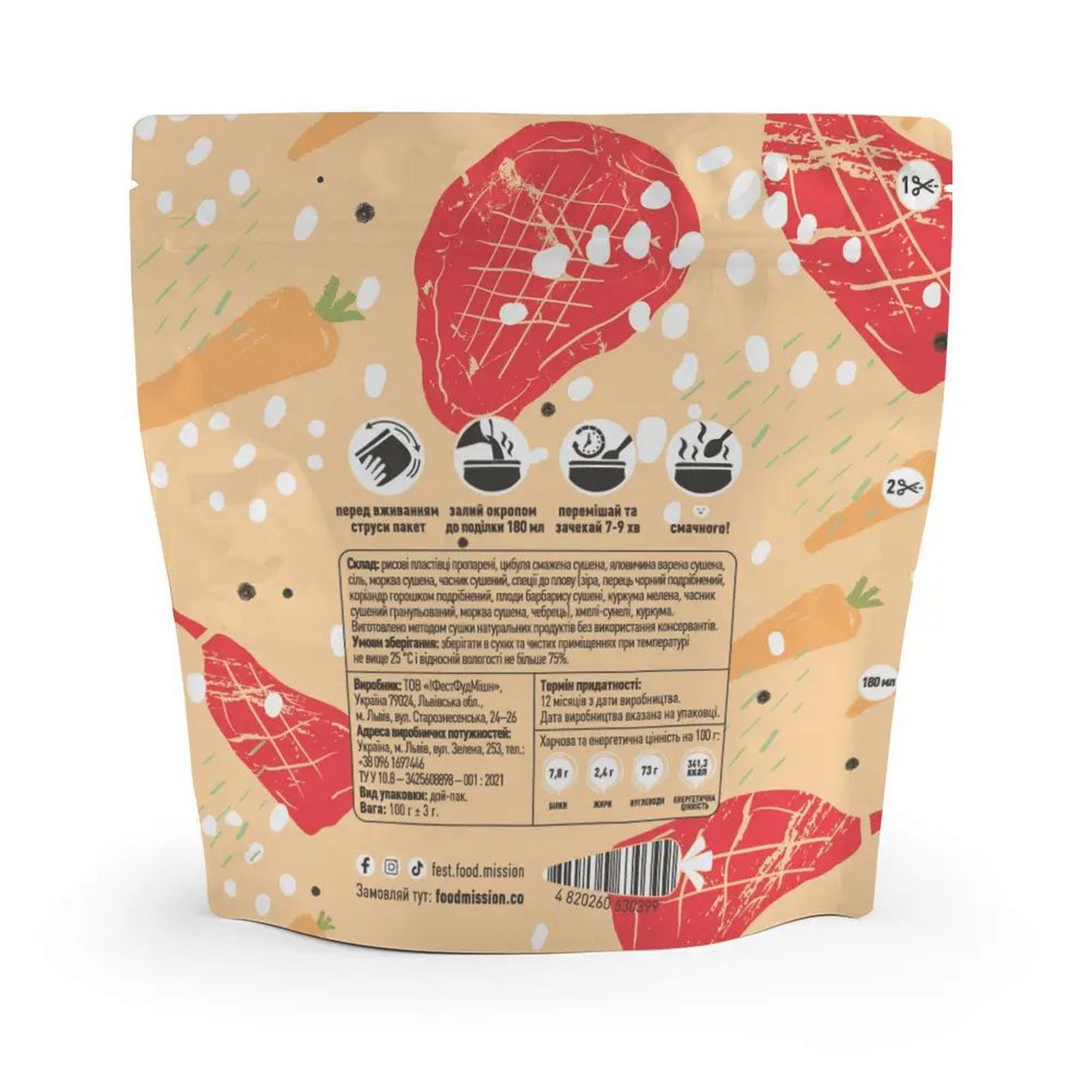 Спосіб приготування: перед вживанням струсити пакет, відкрити та залити страву окропом 180 мл, ретельно перемішати, закрити замок на пакеті та почекати протягом 7-9 хвилин. Після цього, можна використовувати. Смачного!
