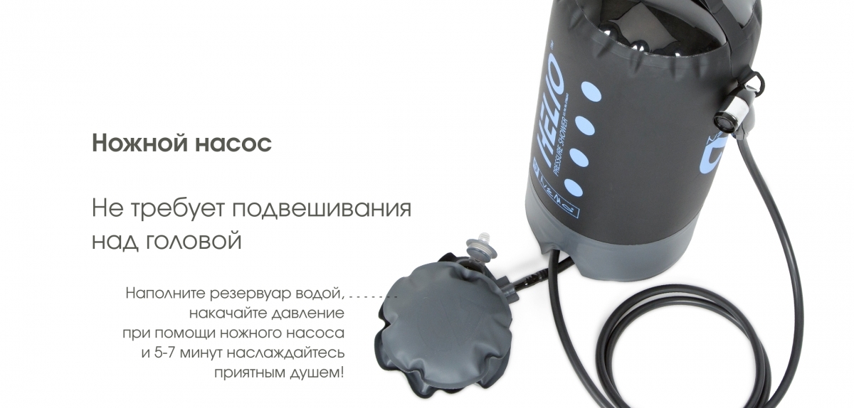 Ножний насос легко і швидко створює робочий тиск в 11-літровому резервуарі. Щоб підтримувати напір, достатньо час від часу наступати на насос ногою під час миття. Об'єму резервуара вистачить на 5-7 хвилин душа під сильним, рівномірним потоком. За ємність можна не переживати: вона не лопне, тиск не може бути надмірним.