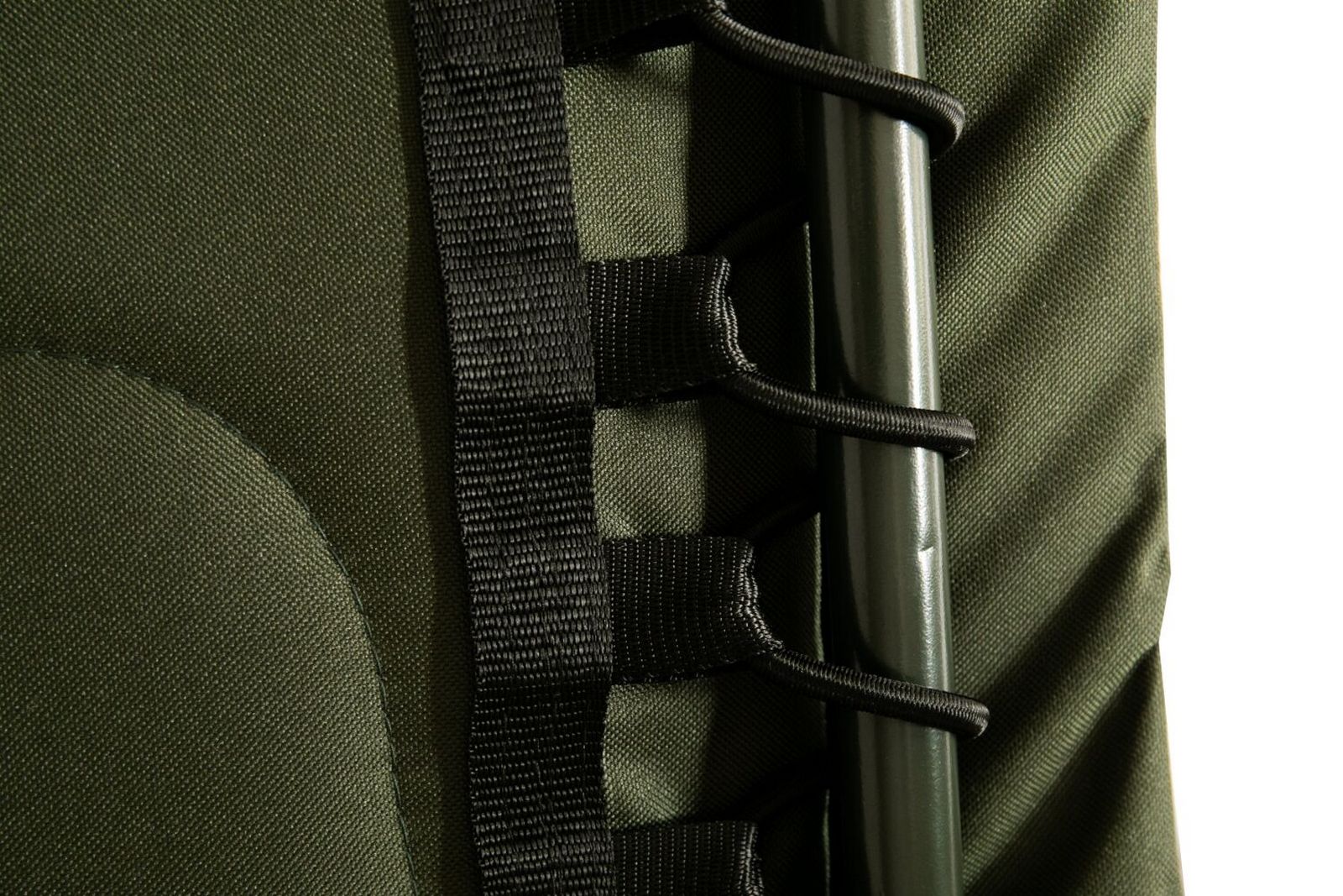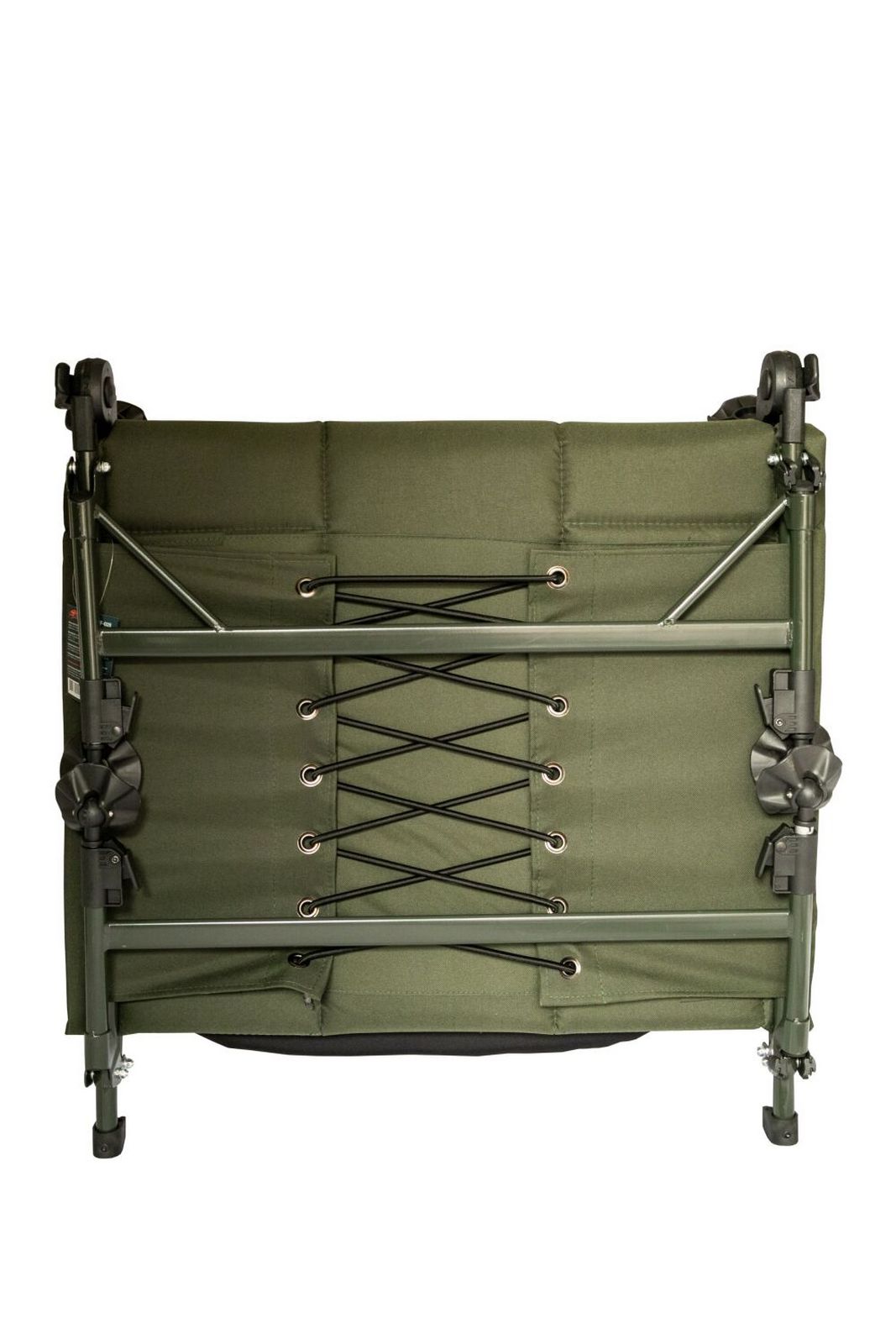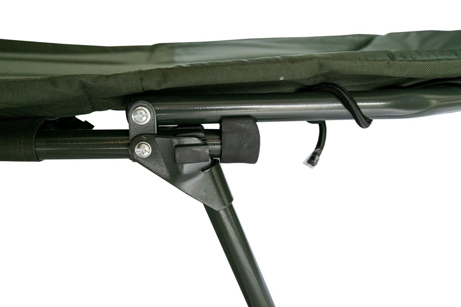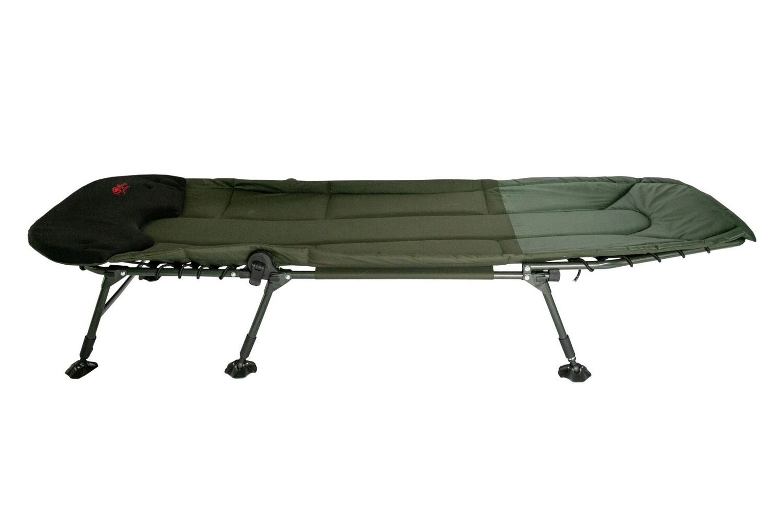 Простая в использовании и очень надежная (благодаря стальному каркасу) карповая раскладушка, способная выдержать нагрузку до 150 кг. Благодаря регулируемому наклону спинки модель может использоваться и как карповая кровать, и как рыбацкое кресло одновременно. Ножки кровати легко складываются и регулируются на необходимую высоту, имеют хорошую устойчивость на любой поверхности. Матрас выполнен из устойчивого к влаге и грязи прочного многослойного полиэстера с PVC покрытием. Легко и быстро складывается и раскладывается.