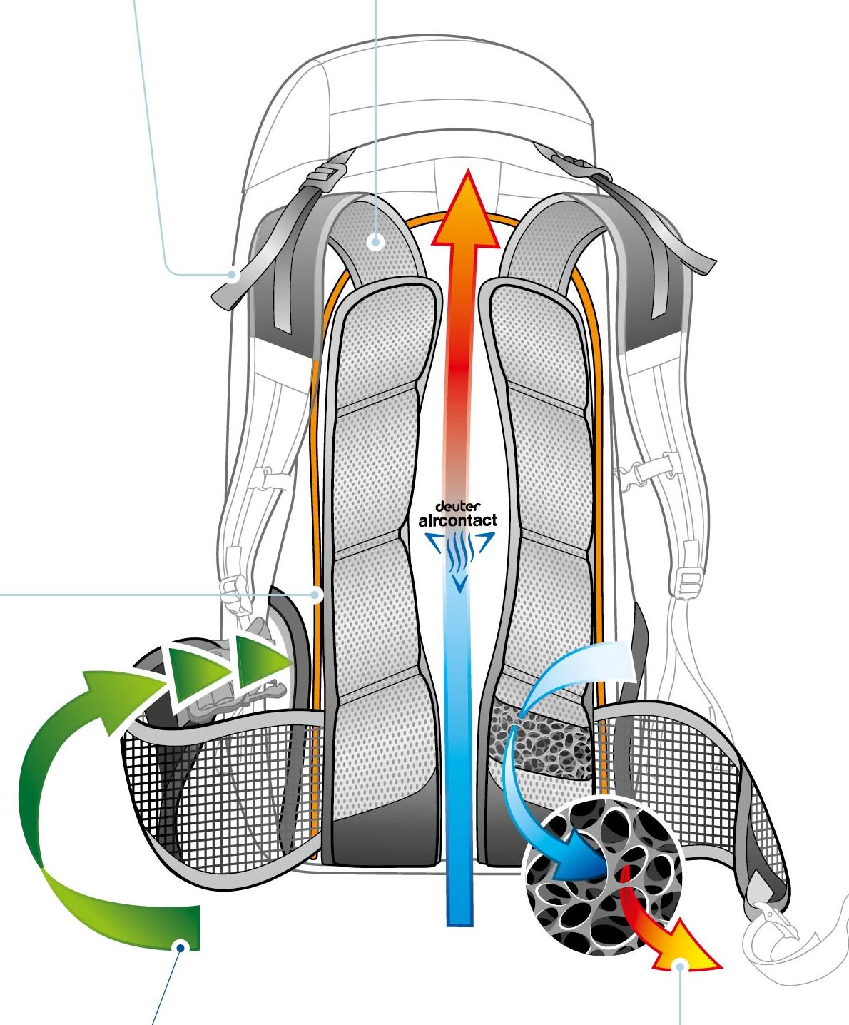 - Спинка Aircontact Trail System - дихаючі порожнисті камери спінених подушок системи дозволяють вазі рюкзака перебувати близько до спини і до центру тяжіння. Таким чином, навантаження стабілізується і розподіляється рівномірно. Крупнопористая структура подушок Airocontact працює як насос при русі, забезпечуючи циркуляцію повітря. Результат: намокання спини знижено більш ніж на 15% порівняно з іншими рюкзаками. (Перевірено в польових випробуваннях, проведених Gabriel L.&T. спільно з Університетом Ерланген, Німеччина).