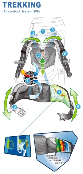 - Легкий спосіб нести важкий вага: система Aircontact чудово адаптується до спини і дозволяє розташувати навантаження близько до центру ваги тіла. Кожен рух викликає циркуляцію повітря в поропласте, ефект насоса виникає навіть у місцях контакту підвісної системи і тіла. Результат: потовиділення на 15% менше і перегрів знижується на 5 С. Перевірено в польових випробуваннях, проведених Gabriel L.&T. спільно з Університетом Ерланген, Німеччина.