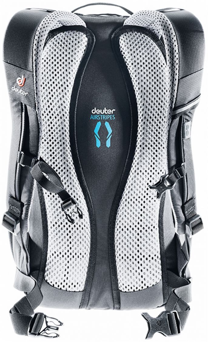 - прекрасна вентиляція, щільне прилягання до спини і безпека велосипедиста забезпечується завдяки системі Deuter Airstripes. Рюкзак сидить на спині як влите і не бовтається. Вузька зона контакту між вентильованими подушками і спиною створює ефект труби між ними, що створює умови для вільної циркуляції повітря практично на 80% площі спини їздця.