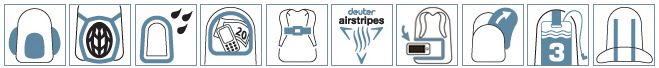 - прекрасна вентиляція, щільне прилягання до спини і безпека велосипедиста забезпечується завдяки системі Deuter Airstripes. Рюкзак сидить на спині як влите і не бовтається. Вузька зона контакту між вентильованими подушками і спиною створює ефект труби між ними, що створює умови для вільної циркуляції повітря практично на 80% площі спини їздця.