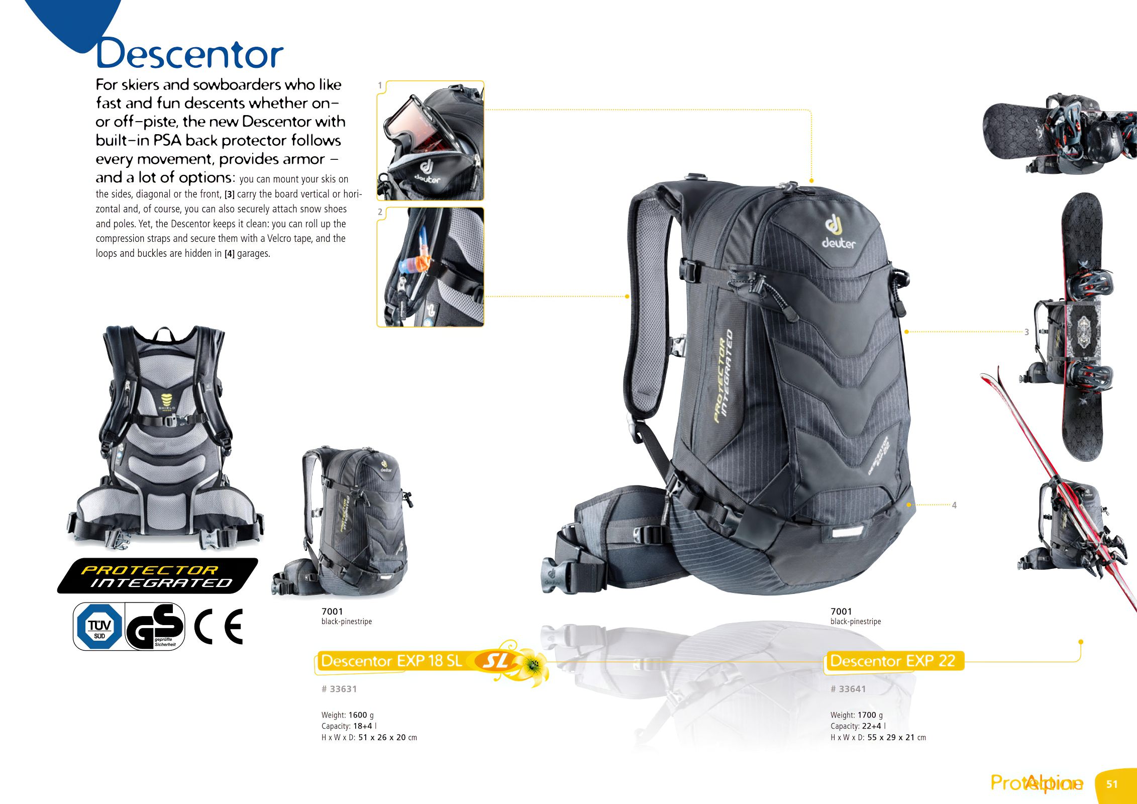 Крутий спортивний рюкзак Deuter Descentor EXP об'ємом 18+4 літри спеціально спроєктований для лижників та сноубордистів, для тих, хто любить швидко та весело кататися сніговими трасами, а також відмінно піде для одноденних походів, підйомів у гори. Новий Descentor з вбудованою сертифікованою PSA захисною плитою спини, він повторюватиме всі ваші рухи й забезпечуватиме "броню" для вашого хребта при падінні. Багато варіантів кріплення лиж і сноуборду: ви можете кріпити лижі з боків, діагоналі або спереду, перевозити сноуборд вертикально або горизонтально і, звичайно ж, ви можете також надійно закріпити снігоступи та трекінгові палиці. Проте, рюкзак Descentor можна робити досить компактним: ви можете стягнути його лямками й закріпити їх липучками, а петлі та пряжки ховаються в кишеньки. Рюкзак чудово підходить, як для дівчат, так і для спортивних хлопців.
