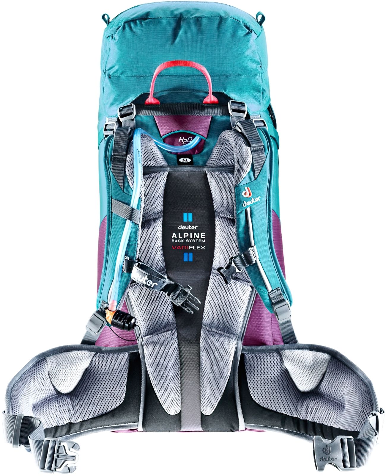 Alpine Back System - підвісна система спинки рюкзака, яка гарантує стабільну рівновагу та знижує навантаження при перенесенні середніх та важких вантажів у гірських регіонах, оскільки вантаж завжди знаходиться близько до центру тяжкості тіла. М'які обтічні смужки спинки з поропласту в серії альпійських Deuter рюкзаків гнучко охоплюють спину при кожному русі і, таким чином, забезпечують щільну і надійну посадку, підвіска легко слідує за складними рухами тіла. Канал між рельєфними подушками на спині забезпечує приємну вентиляцію, створюючи своєрідний ефект труби димоходу